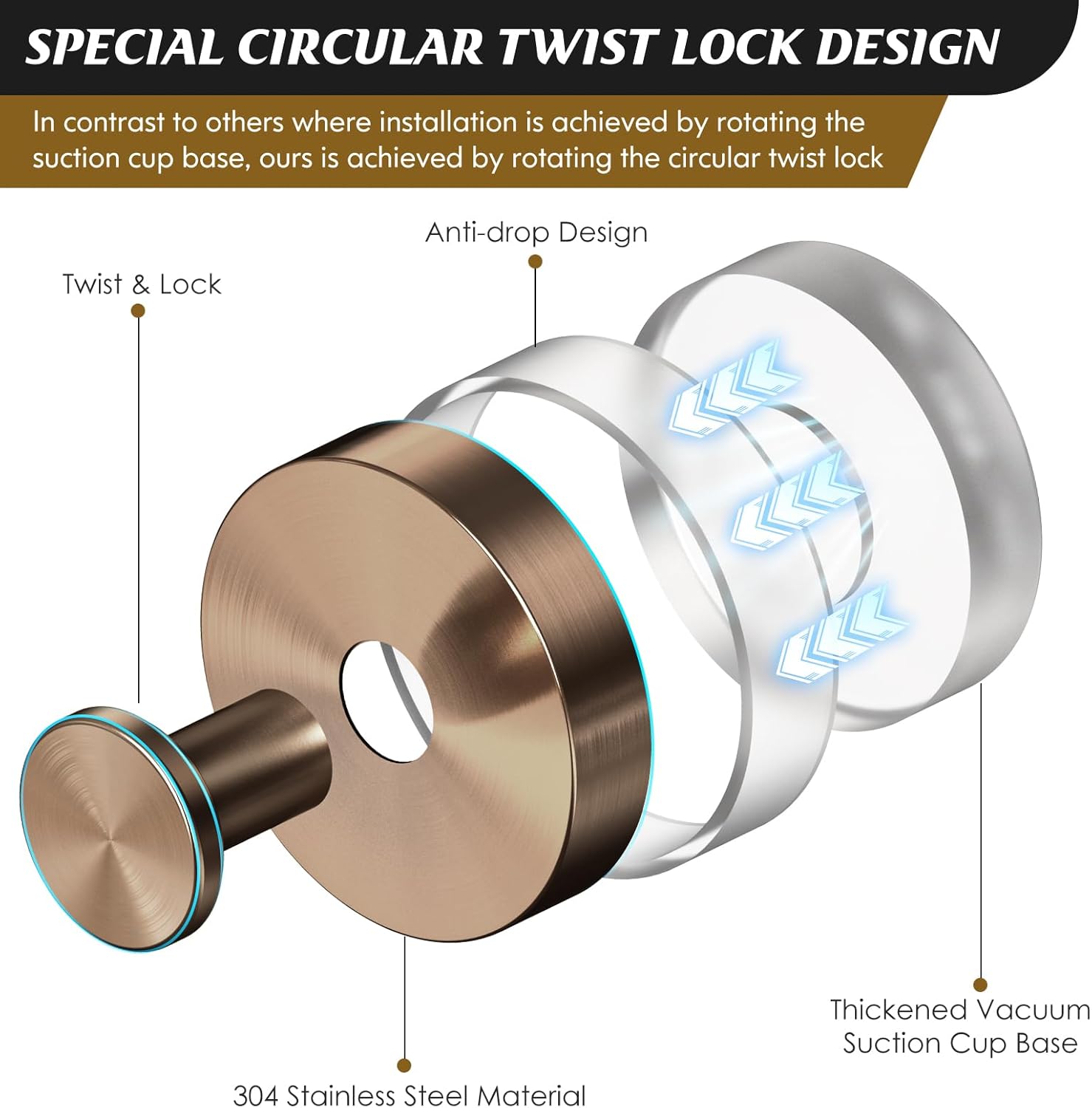 - 【Easy Installation & Remove Without Trace】With the strong adhesive and suction cup on the back,these adhesive towel hooks will stay securely in place wherever you need them.You need to remove the protective film on the back before use,and simply turn the knob counterclockwise to fix and press the robe & towel hooks on the wall,then twist the knob clockwise to complete the installation,detailed steps can be viewed in the instructions.Simple to install and equally easy to remove,the hooks leave no traces behind