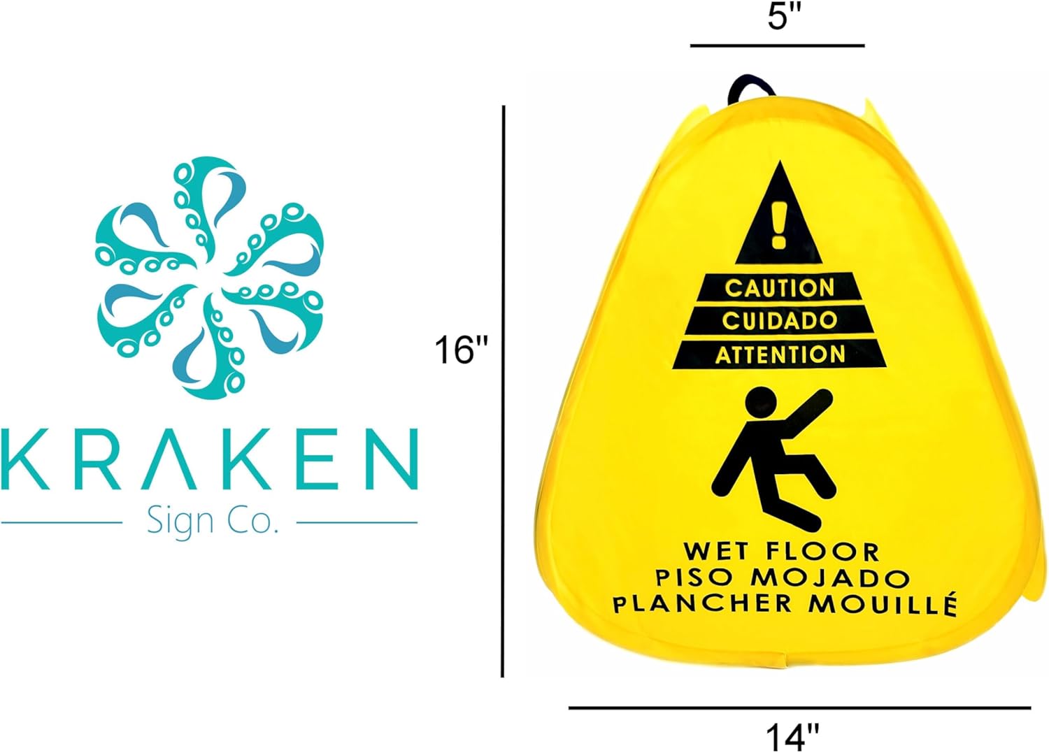 - Highly visible: These Kraken Sign Co. Pop-up Caution Wet Floor Signs are designed to easily be seen from a distance. The bright yellow color and bold black text make it eye-catching and effectively warn individuals about the potential hazard and preventing accidents
