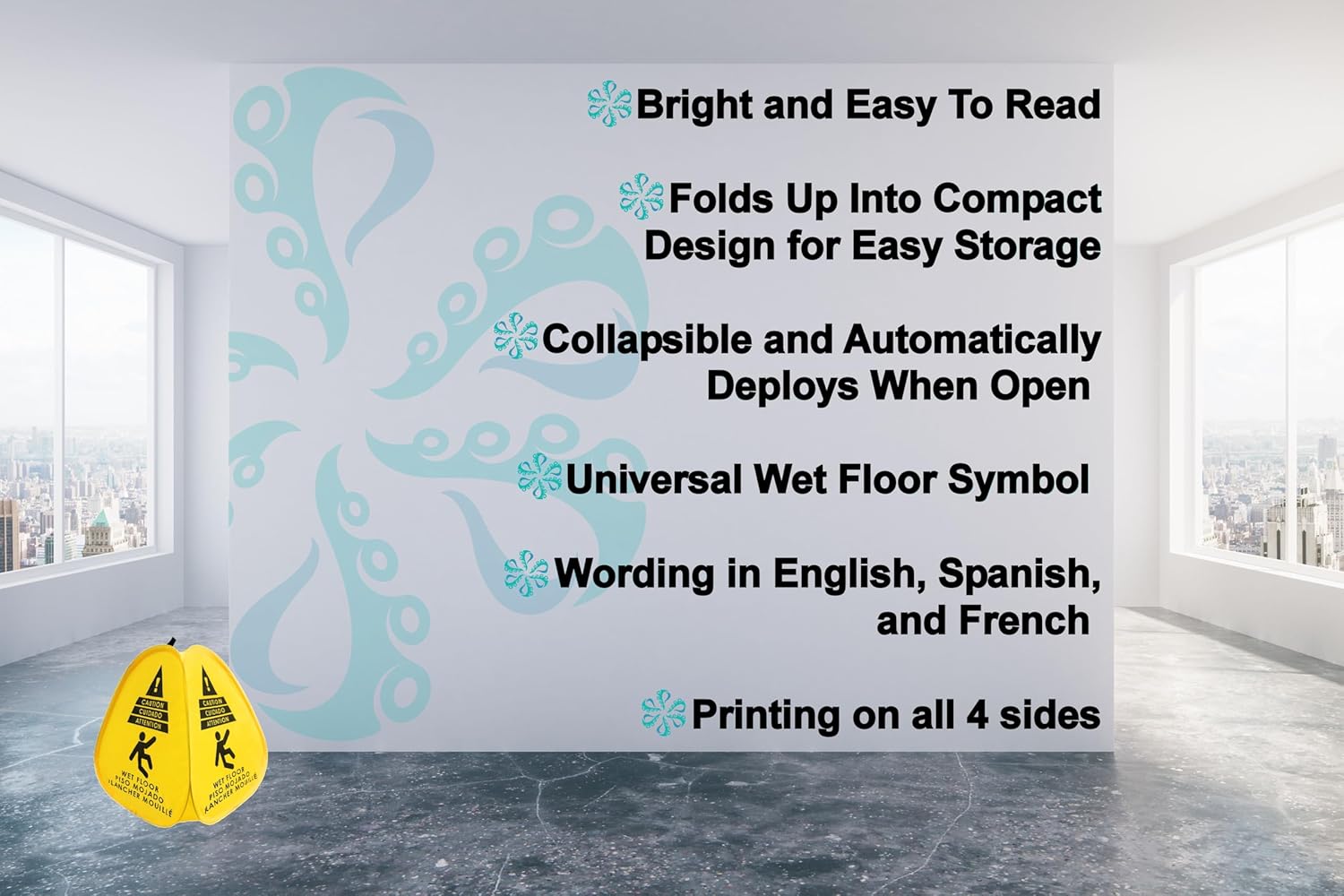 - Highly visible: These Kraken Sign Co. Pop-up Caution Wet Floor Signs are designed to easily be seen from a distance. The bright yellow color and bold black text make it eye-catching and effectively warn individuals about the potential hazard and preventing accidents