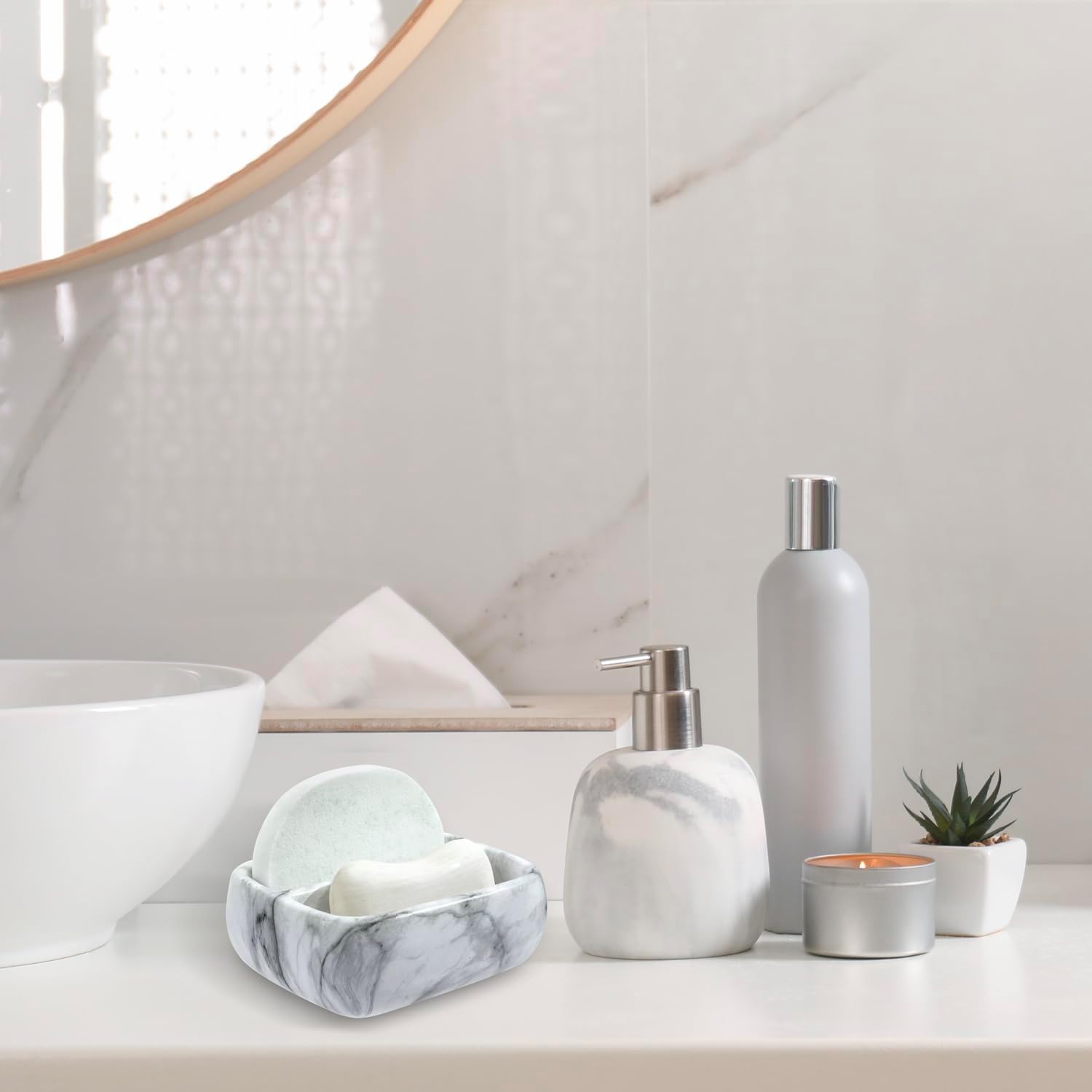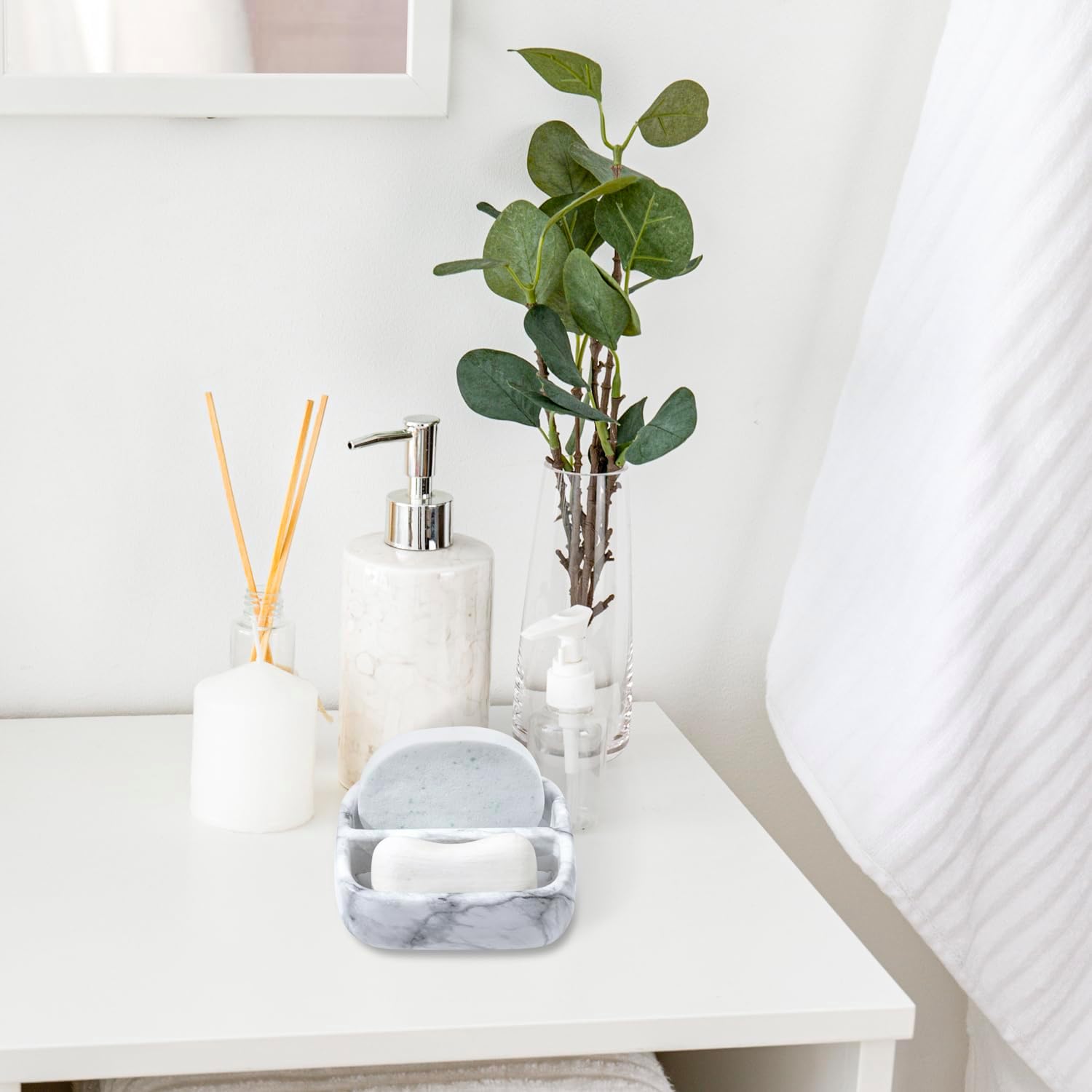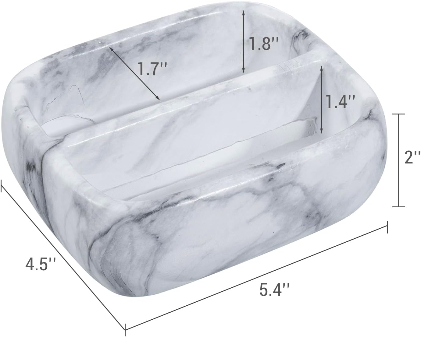 - Dual-sponge container is crafted from high-quality white resin with a realistic marble pattern that blends in seamlessly with a wide range of dΓ©cor **Includes bottom foot pads**