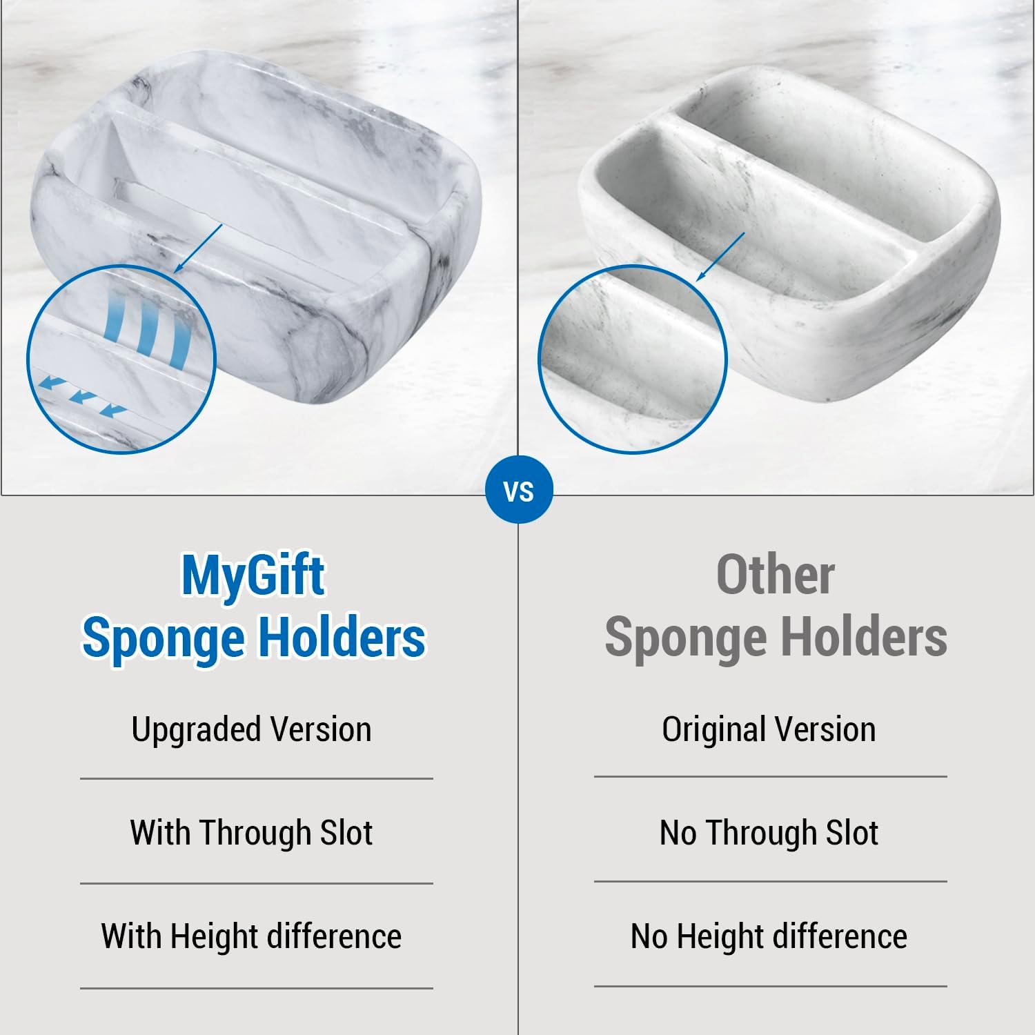 MyGift 5.4 Inch Deluxe Modern White Marble Pattern Resin Double Sponge Holder, Kitchen Sink Countertop Dish Cleaning Sponges or Scrubbing Pads Bowl with 2 Compartments
