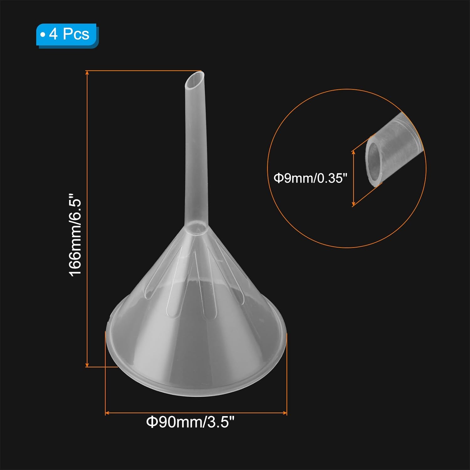 - Color: Clear; Material: PP Plastic; Top Opening Dia: 90mm / 3.5 inch; Outlet Dia: 9mm / 0.35 inch; Length: 166mm / 6.5 inch; Packing List: 4 x Clear Plastic Funnel