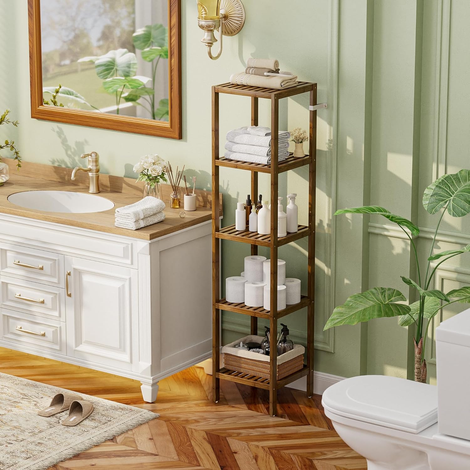 - β GREAT FOR SMALL SPACE STORAGE: With 5 11.8" tall open shelves, this space-saving bamboo shelf offers plenty of storage but only takes up 13" x 13.4" of floor space, perfect for narrow spaces or corners of room to store odds and ends
