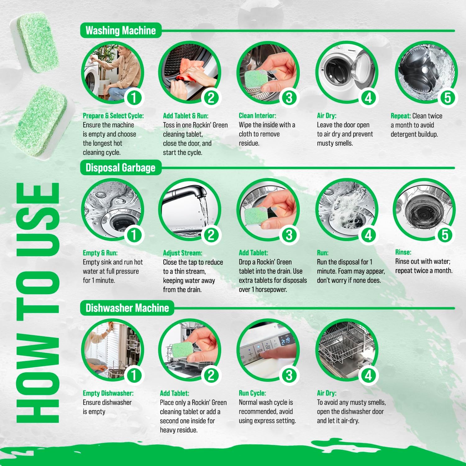 Rockin' Green Deep Cleaning and Deodorizing Tablets for Dishwashers, Washing Machines, and Garbage Disposals, Removes Odor and Residue (Multi-purpose Cleaning Tablets, 24 Pack)