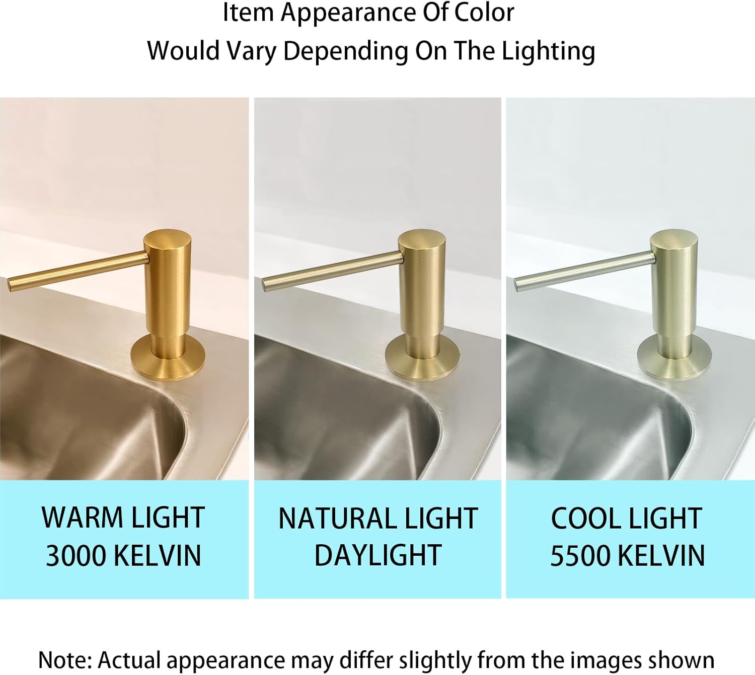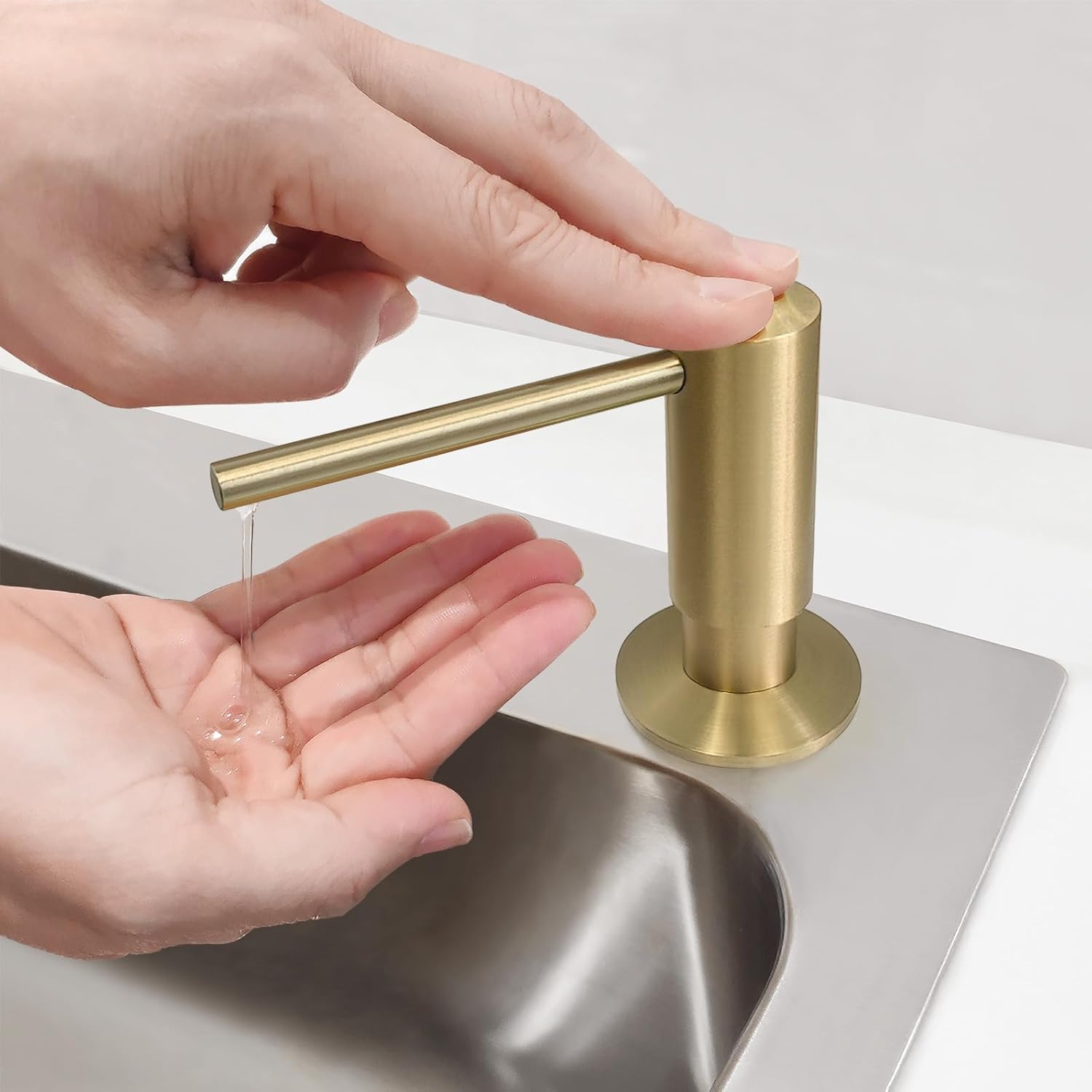 • Built To Last:Sturdy built in sink soap dispenser for kitchen sink, solid brass pump head and threaded tube with 17 OZ PET plastic bottle, corrosion resistant spring. SOLID BRASS CONSTRUCTION brushed gold rust resistant finish that will not tarnish as time goes on. The soap dispenser pump mechanism is designed for long lasting excellent performance to dispense consistently with each and every press. Coordinates with most faucet models from different brands.