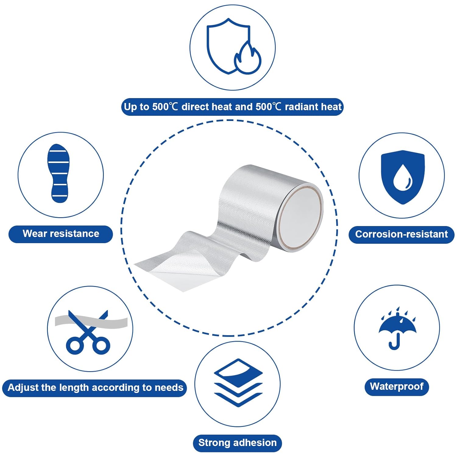 - Quality Material: the adhesive heat shield tape is made of glass fiber fabric with an aluminized outer facing, which is elasticity, wear resistance, heat insulation, high temperature resistant, corrosion resistant and waterproof, and strong adhesion; This foil tape can provide ultimate protection from extreme heat as well as oil spills, dirt, grease and road grime