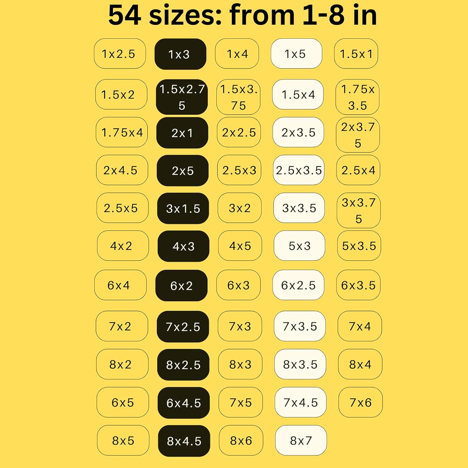 - 1.5x1 in stickers, 2x1 in, 3x1.5,3x2,4x2,4x3,5x3,6x4 in custom labels are available.