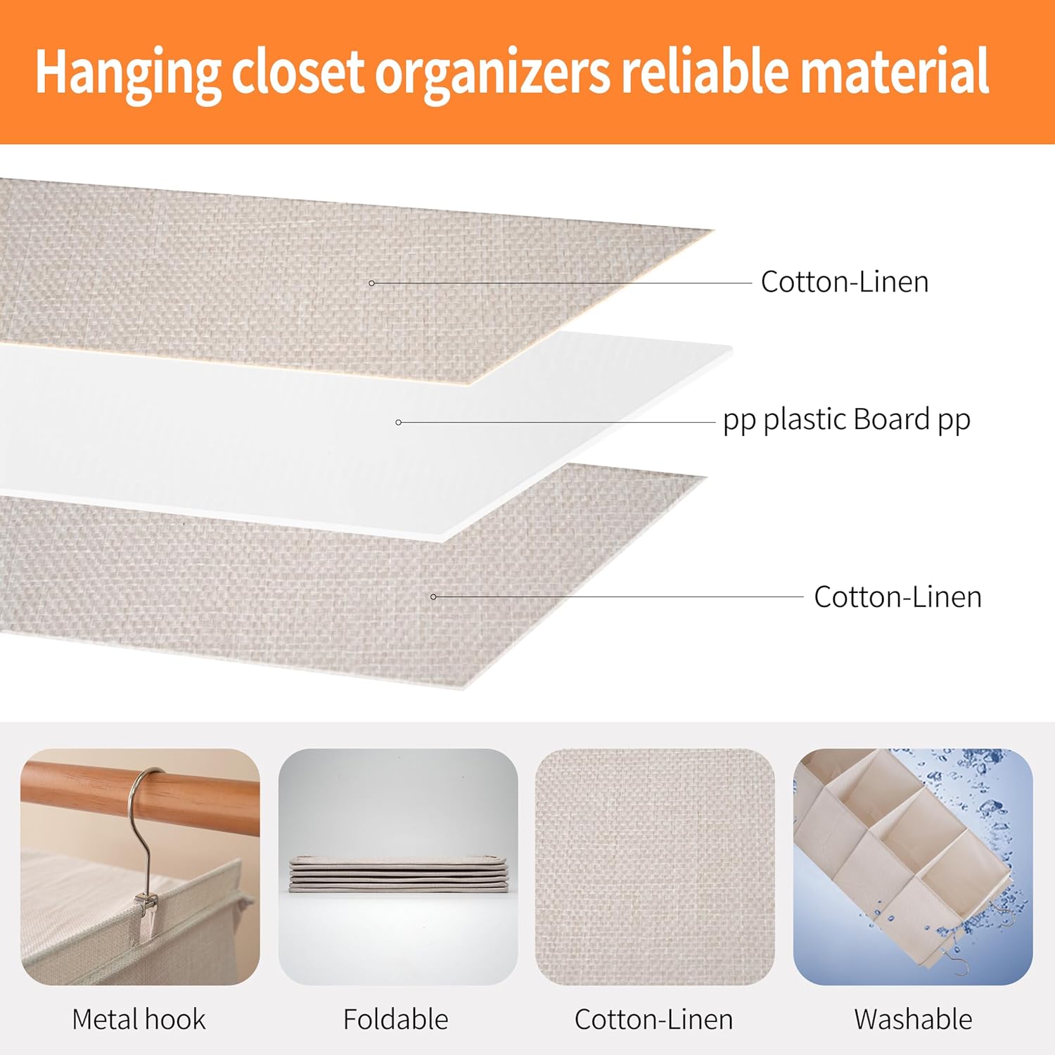 - The foldable design of this hanging closet organizer allows for easy storage and transport, making it perfect for small spaces, dorm rooms, and travel.