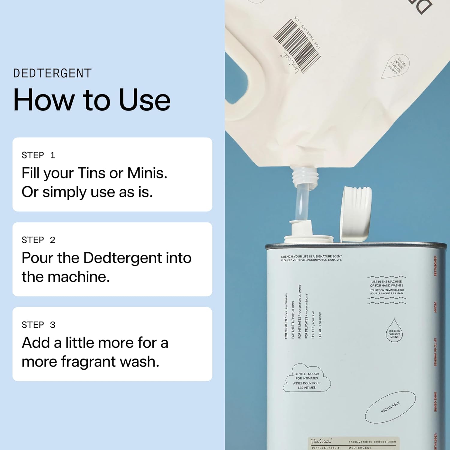 - GENTLE, PREMIUM CARE: Infused with plant-derived ingredients, this non-toxic, dye-free, and vegan detergent refreshes fabrics, softens clothing, and preserves colors while leaving garments lightly scented with DedCool’s signature fragrance.