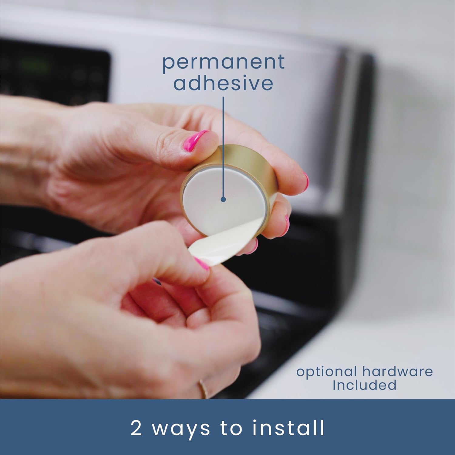 - One 4 pack of S&T INC. round adhesive brushed gold push towel hooks measuring 1.7 inches in diameter by 1 inch in height, plus 4 screws and 4 anchors