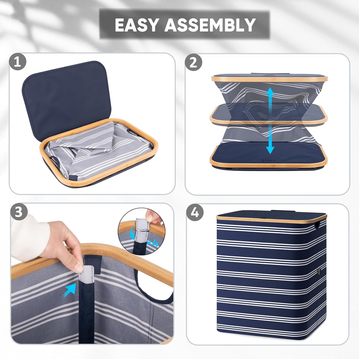 - [SLEEK DESIGN AND PREMIUM MATERIALS] Our laundry basket with lid adds a touch of elegance to any room. The natural bamboo rim gives it a timeless appeal, while the sturdy internal support structure ensures it maintains its shape, even when empty.
