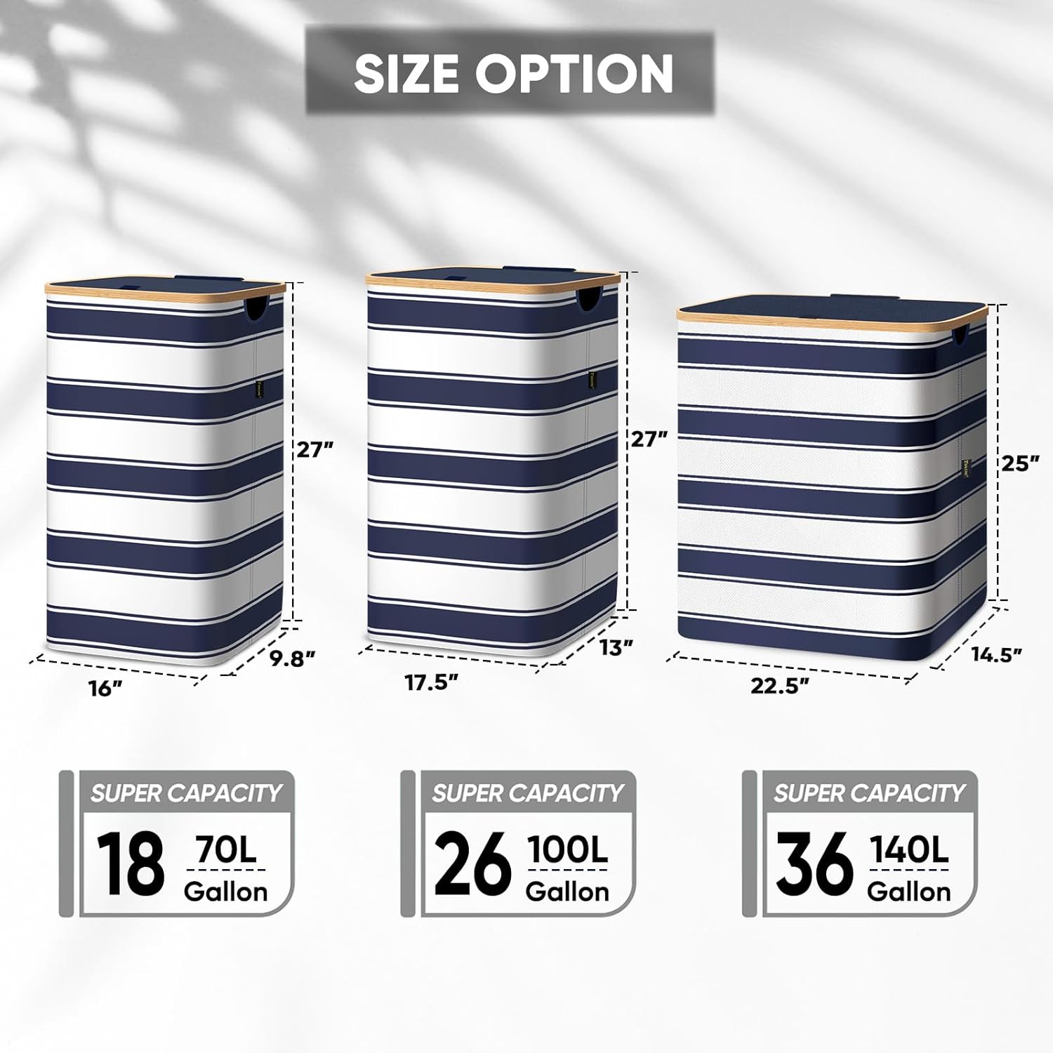 BALEINE Laundry Hamper with Lid, Tall Laundry Baskets with Bamboo Pull Handles, Large Laundry Bin with Internal Support (36 Gal/140L, Blue Stripe)