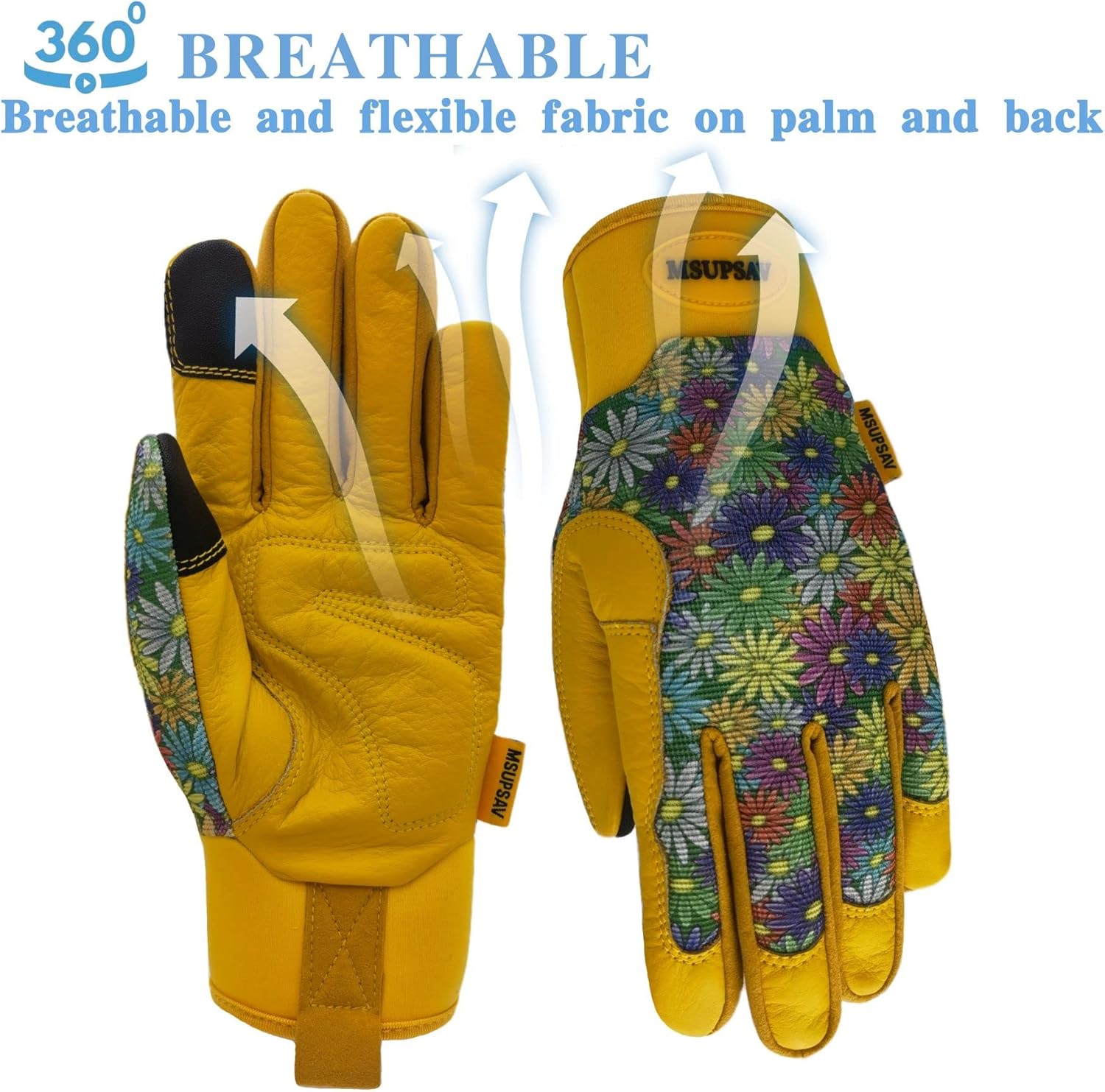 - 【MSUPSAV GARDEN GLOVES FOR GARDENING】Stretchable double-layer spandex design back keep your hands flexible,breathable&comfortable on the job. Leather with foam padded palm and reinforced fingertips increase durability.Supportive adjustable with hook& loop strips closure cuff for snug secure fit.
