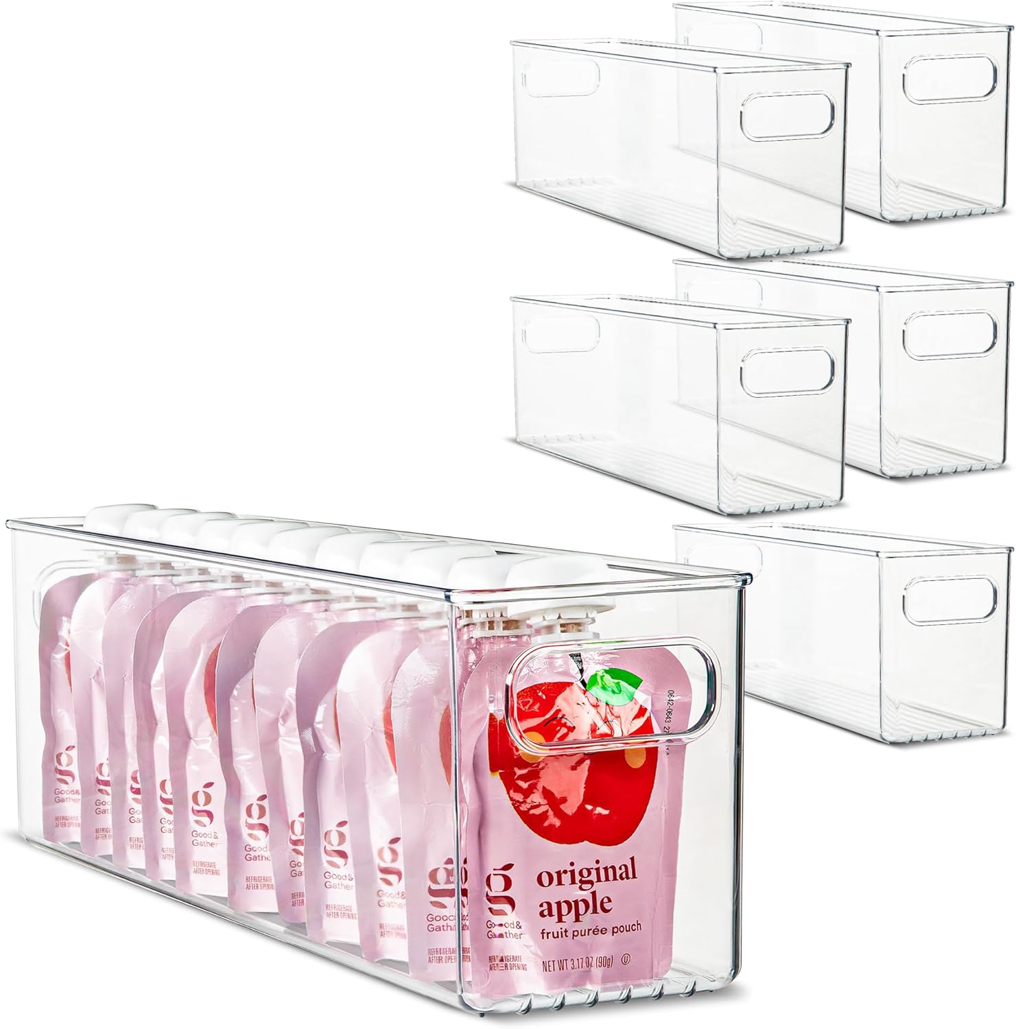 - Perfect for organizing: These bins are perfect for creating calm, clean and organized spaces. Great for upper cabinets & pantry shelves, for organizing fridge/freezer, pantry, cabinet storage, medicine cabinet or anywhere in your home. Ideal to use for yogurts, baby food, pouches, cans, dry goods, fresh fruits and vegetables, potatoes, apples, boxed foods, juices, drink boxes. Also good for snacks.