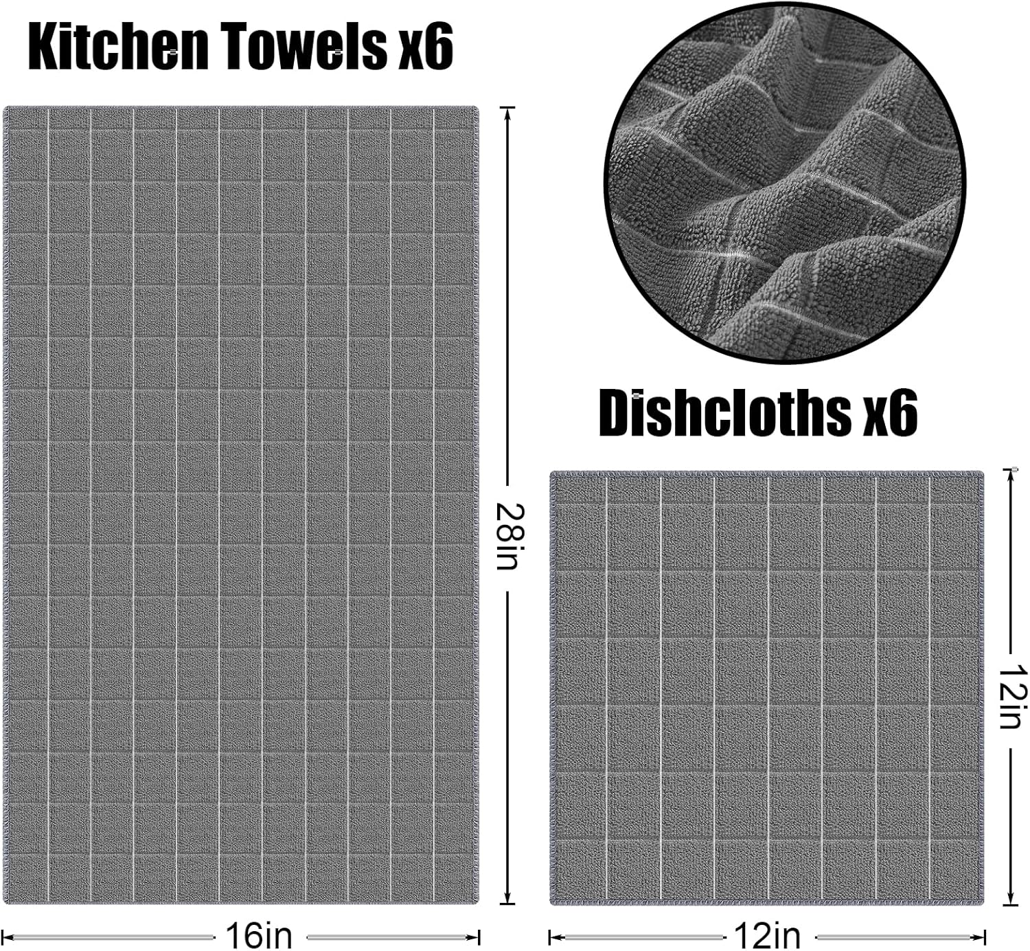Homaxy Microfiber Kitchen Towels and Dishcloths Set, 12 Pack Soft and Absorbent Dish Hand Towels Bulk, 28 x 16 Inch & 12 x 12 Inch Quick Drying Rags for Washing Dishes, Grey