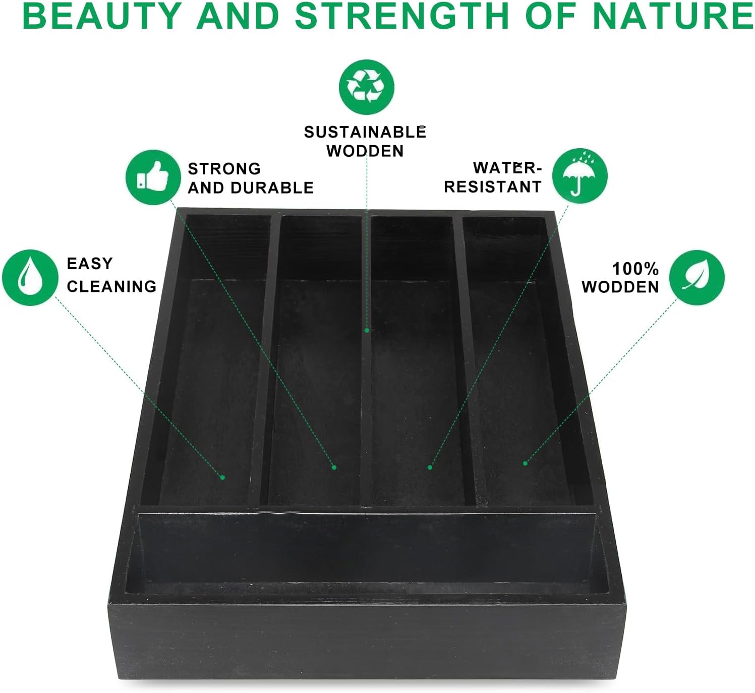 Small Wooden Silverware Organizer Tray Narrow Kitchen Drawer Dividers Utensil Organizers and Storage Black Cutlery Trays Spoon Flatware Organizer for Drawer Bamboo Cutlery Utensil Holder Tray