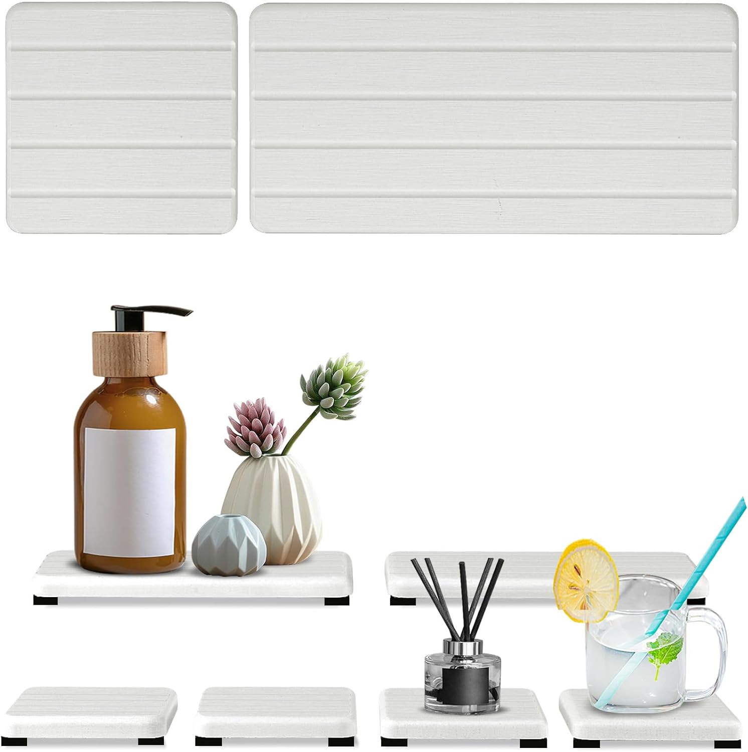 - More Anti Slip and Ventilated --- The silicone footpads boost the slip-resistance of absorbent stone coasters while keeping them out of the bathroom vanity. This design improves the contact surface between diatomaceous earth coasters and air, accelerates the evaporation of water, and extends the service life of the water absorbing stone tray for sink.