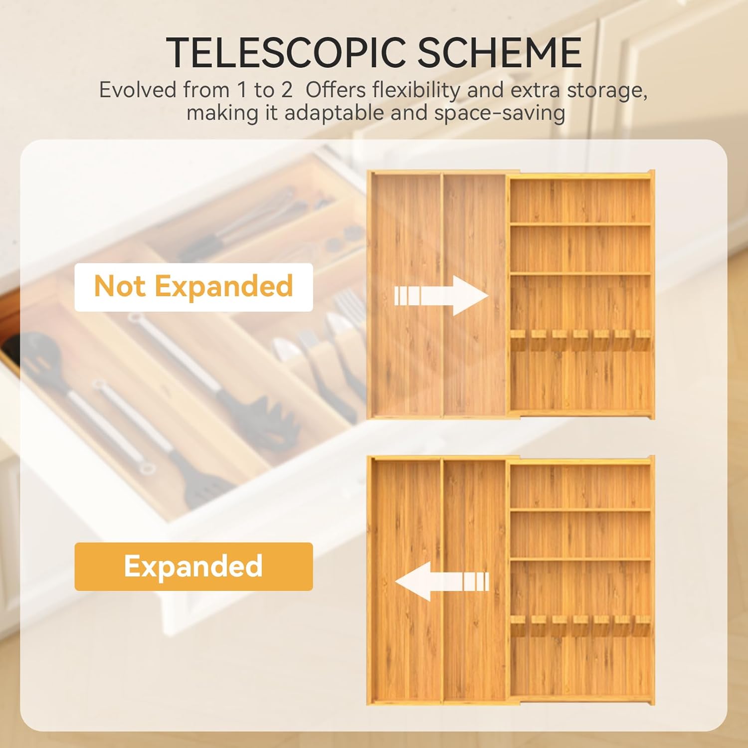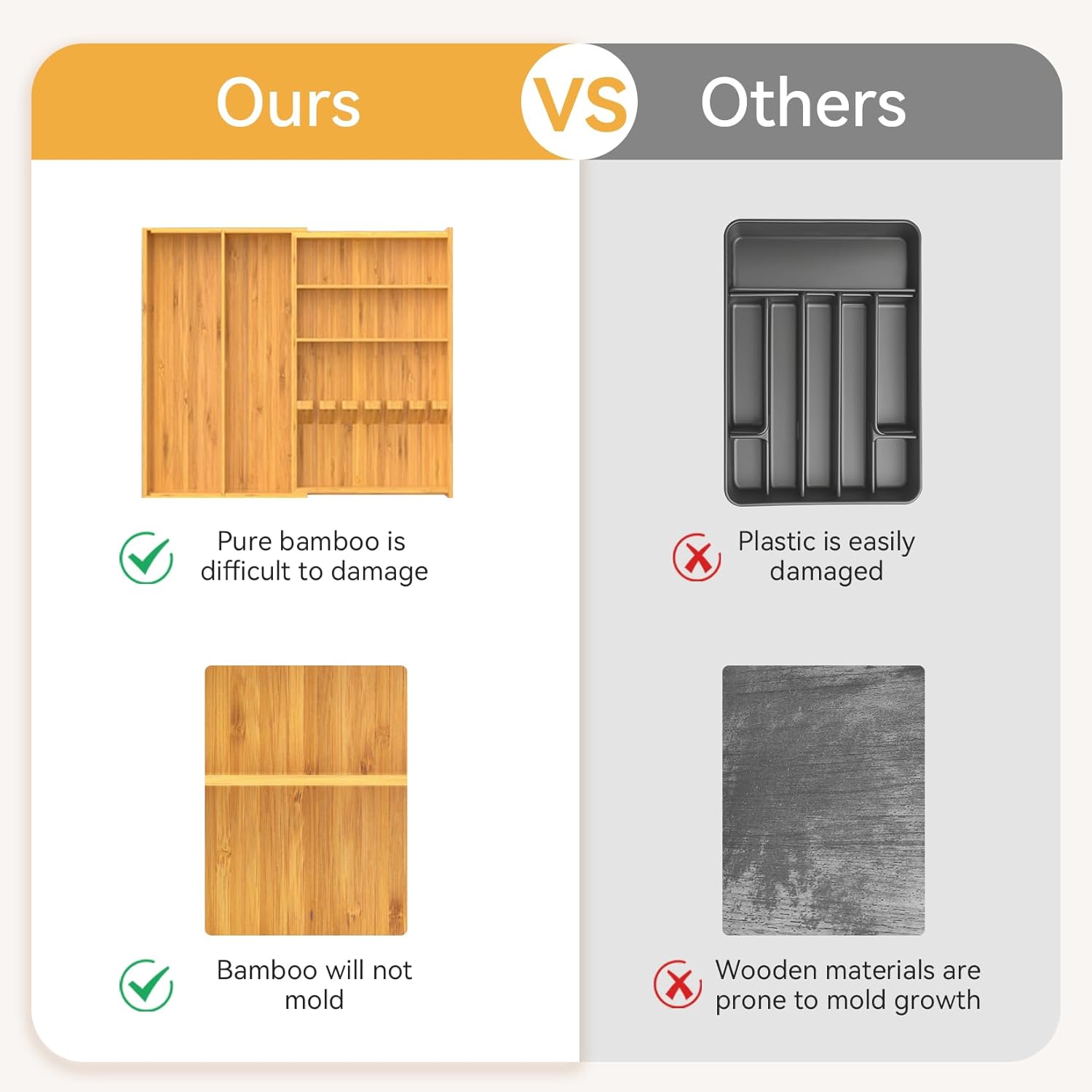 - ăPure Natural Bamboo Utensil Drawer Organizeră: Our kitchen drawer organizer is made of naturally regenerated bamboo, and the entire silverware drawer organizer is made of pure bamboo material. Bamboo material is not as easily damaged as plastic silverware drawer organizer, nor as moldy as wooden cutlery boxes, making it the best helper in the kitchen