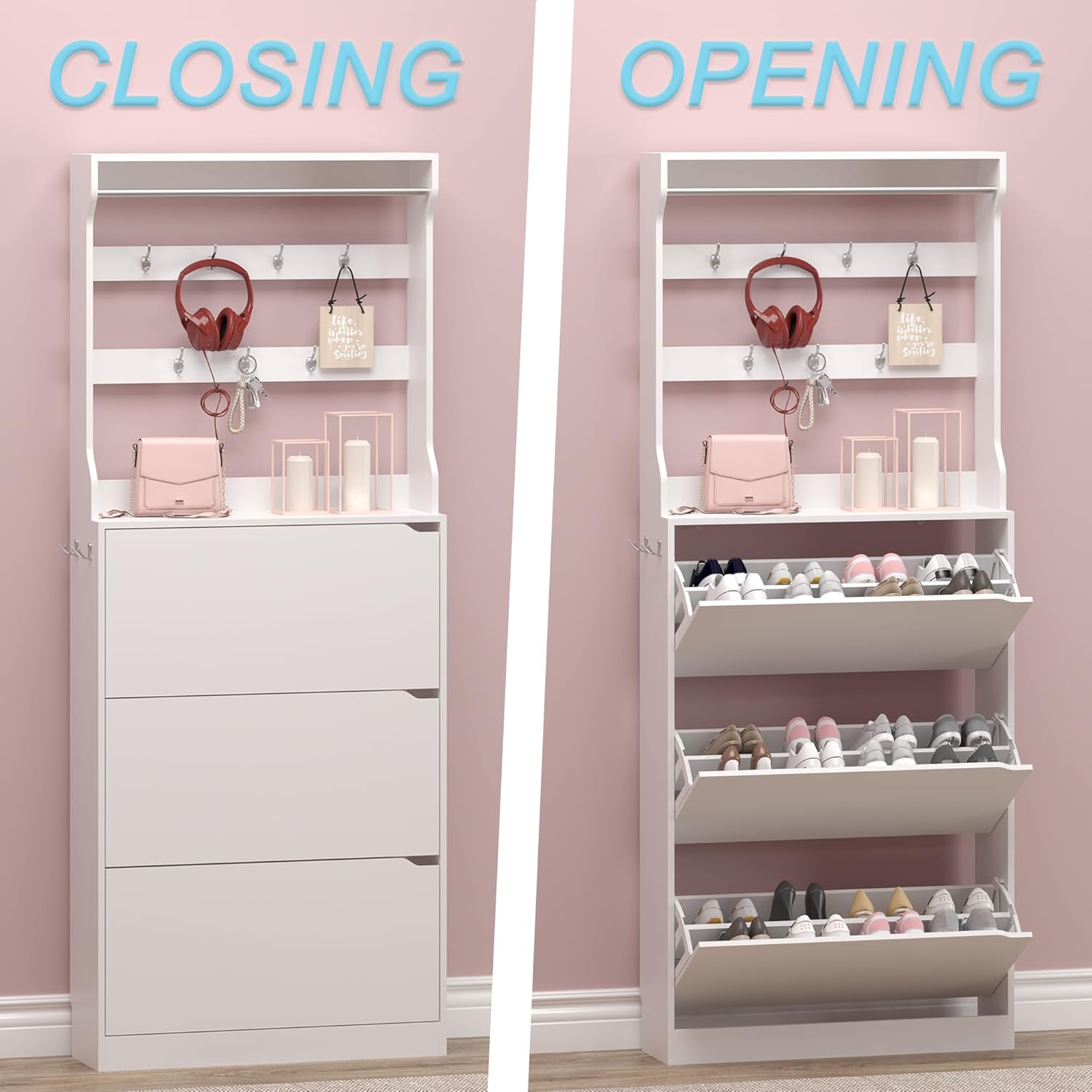Shoe Cabinet with 3 Flip Drawers & Coat Rack, Narrow Hidden Shoe Storage Cabinet, 2-in-1 Hall Tree Slim Freestanding Shoe Rack Organizer for Entryway, Hallway, and Living Room