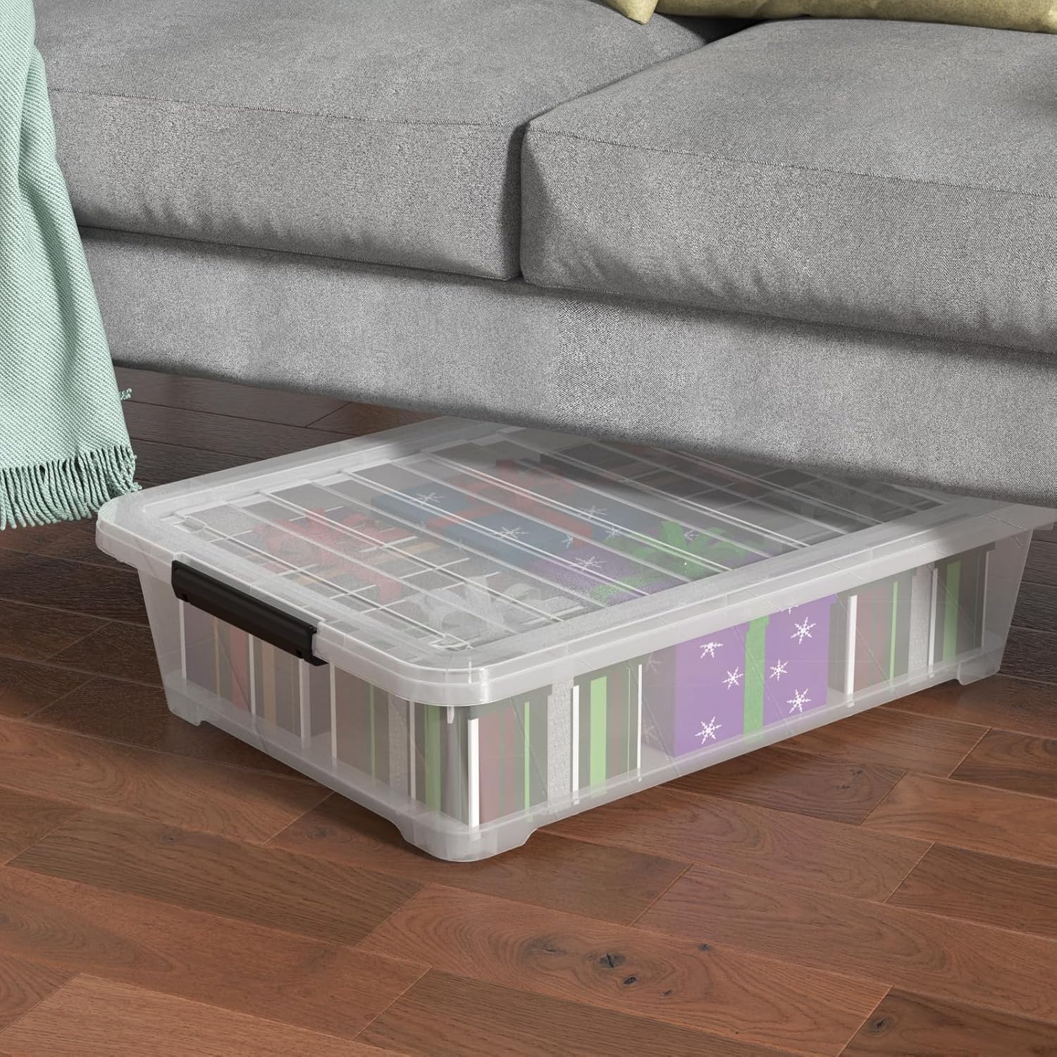 Set of 3 42 L Clear Plastic Under The Bed Storage Bins, Underbed Box with Latching Lid and Wheels, Flat Container for Dormitory, Apartment, Attic
