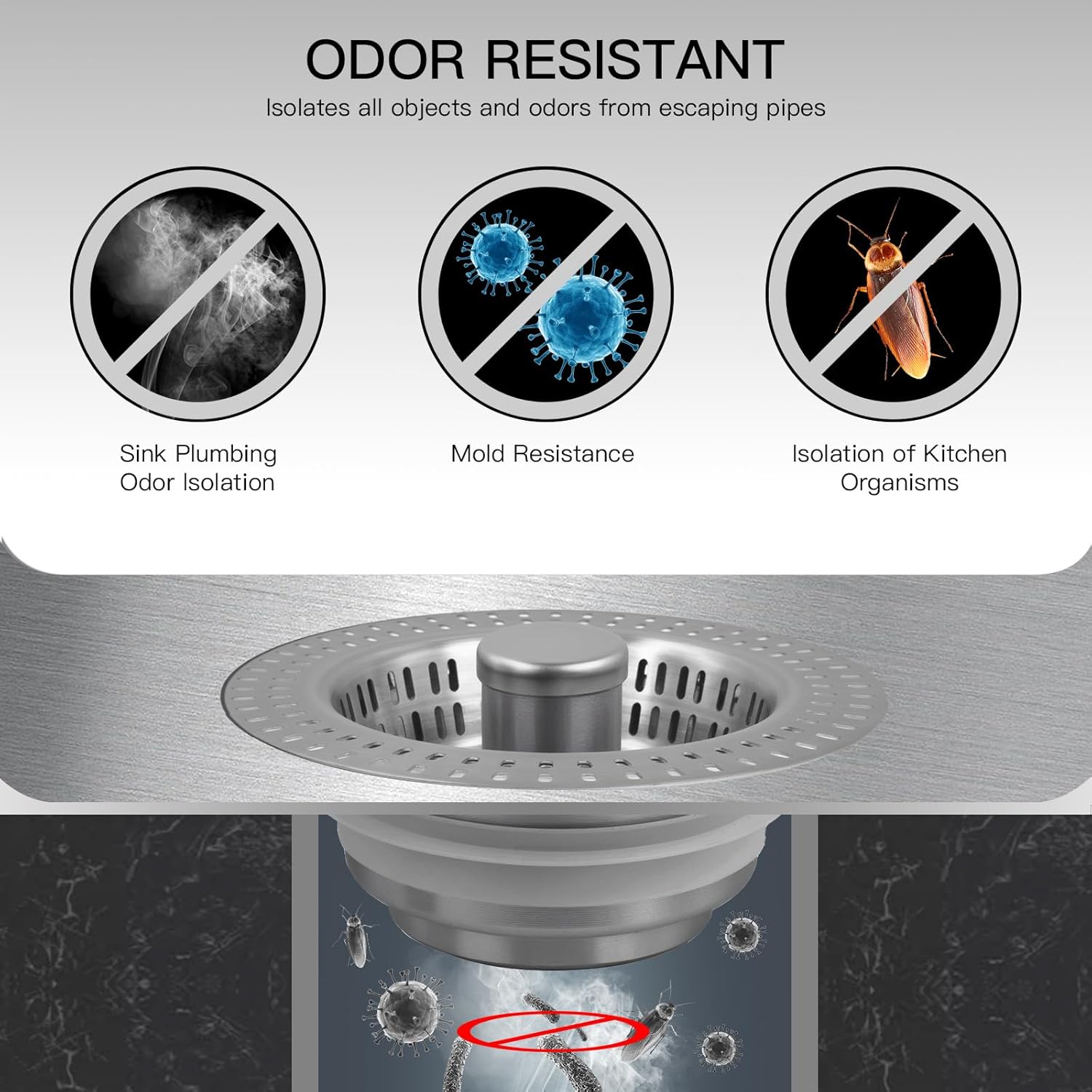 - 3-in-1 Kitchen Sink Strainer and Stopper: One item, three Functions. The kitchen sink plug combo has the functions of storing and draining water, filtering and keeping odors out. Sink stopper helps to save water while washing dishes, a sink filter basket to collect food scraps when draining, โ ๏ธNote: Suitable for deep sinks