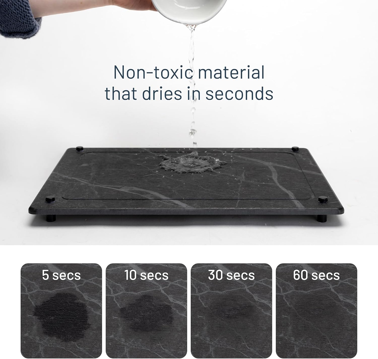 - SUPER ABSORBENT & QUICK DRYING: Our advanced diatomaceous earth absorbs up to 150% of its weight in water and evaporates moisture within minutes. The elevated design with non-slip steel feet ensures optimal air circulation, keeping countertops completely dry. The dark stone color hides water spots and works perfectly with small drying racks.