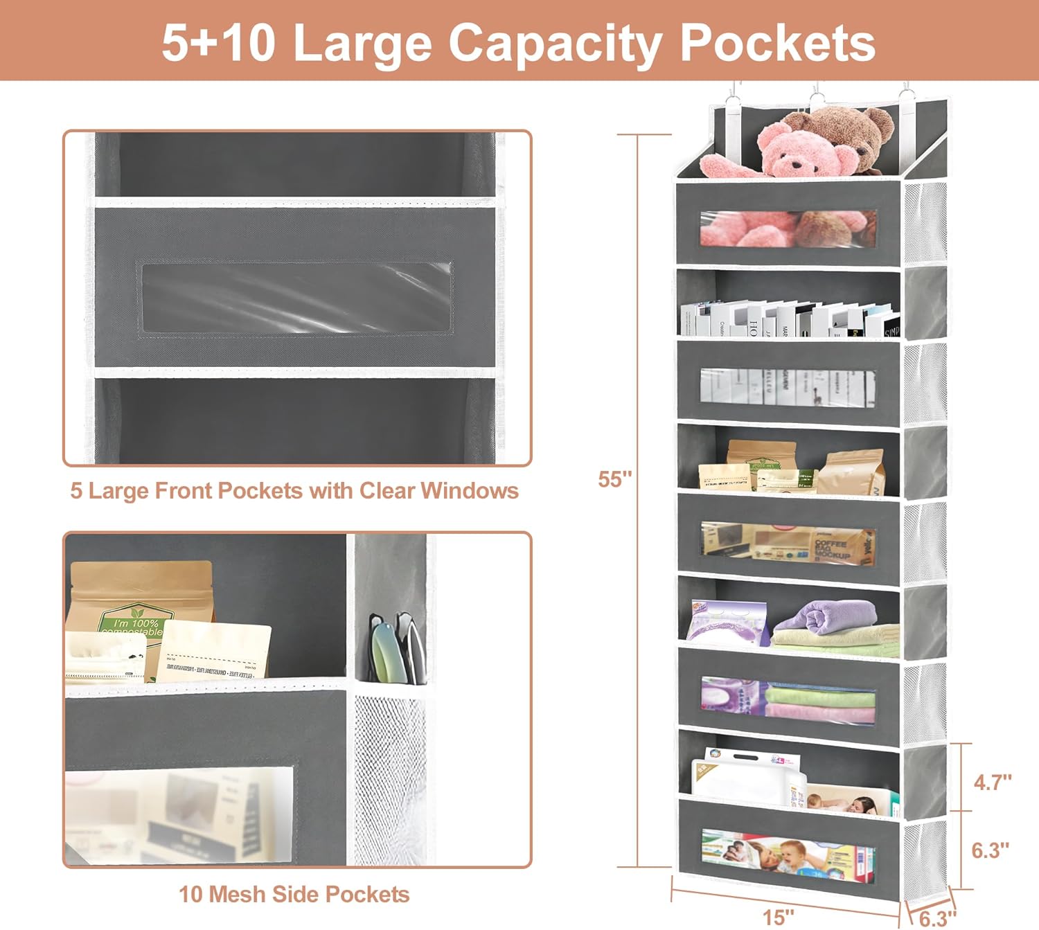 2 Packs 5-Tier Over The Door Organizer with 10 Side Mesh Pockets, 48 lbs Load Capacity, 3 Hooks Design, Hanging Organizer with Clear Windows for Bathroom, Bedroom, Nursery, Kitchen-Grey