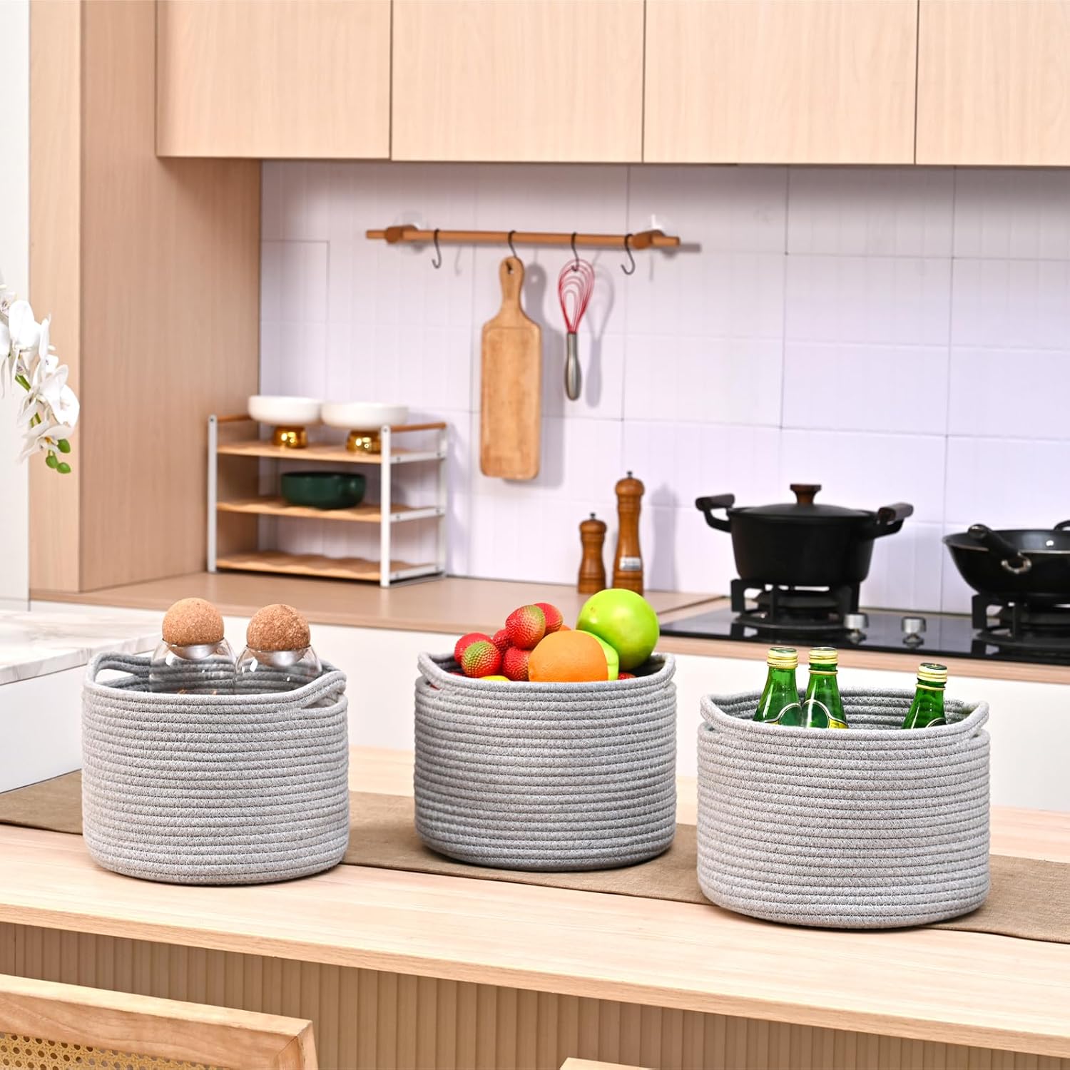 Small Storage Baskets for Organizing, Organizer Baskets for Shelves, Small Woven Basket for Storage, Cute Basket for Gifts Empty, Soft Cotton Rope Baskets, 9.7"×9.7"×7" (3 Packs) Grey
