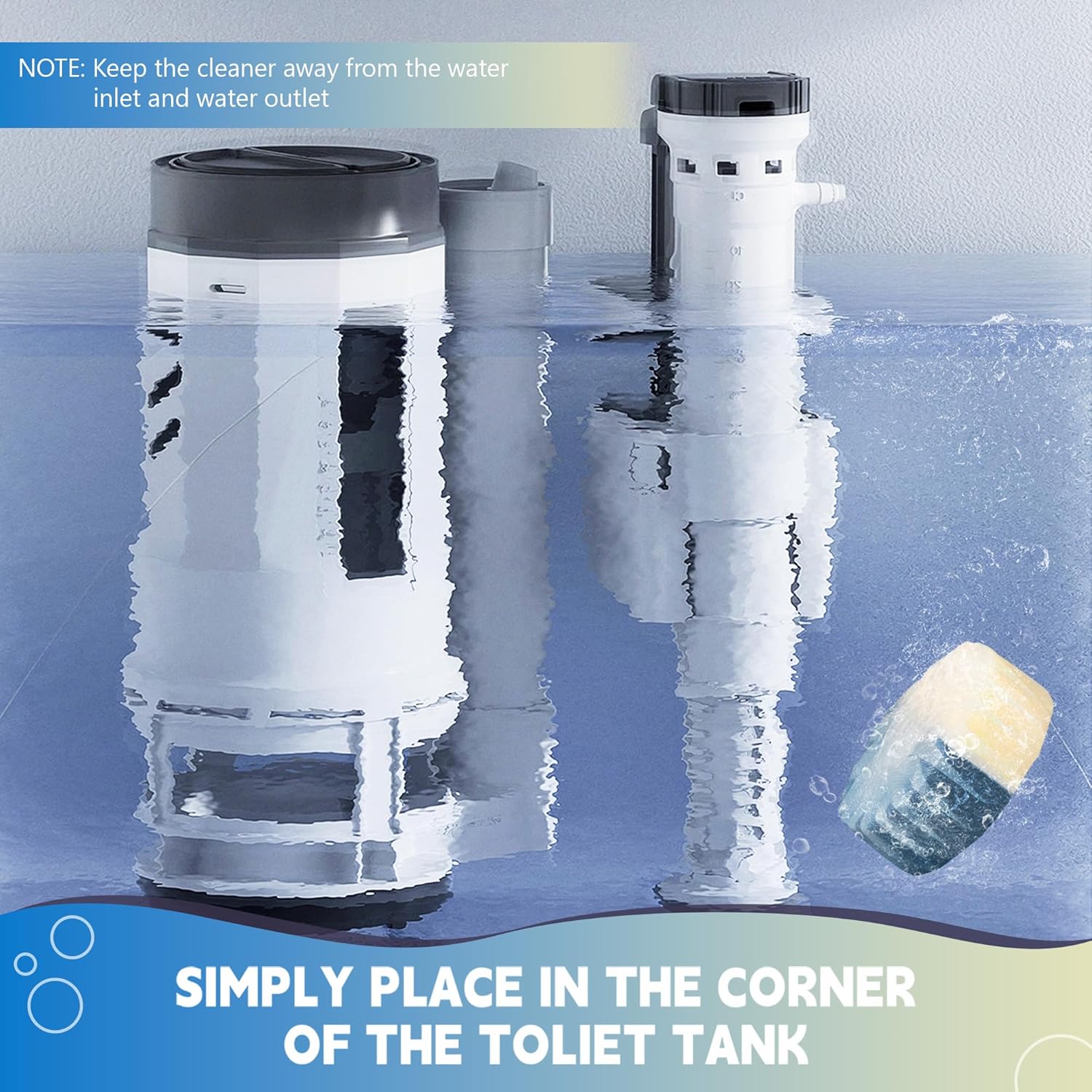 - Easy to Use: Simply place a piece of toilet tank cleaner tablet into the tank (away from the spout and inlet) and let it fully dissolve for at least 30 minutes;(Please note, do not remove the water-soluble transparent protective film)