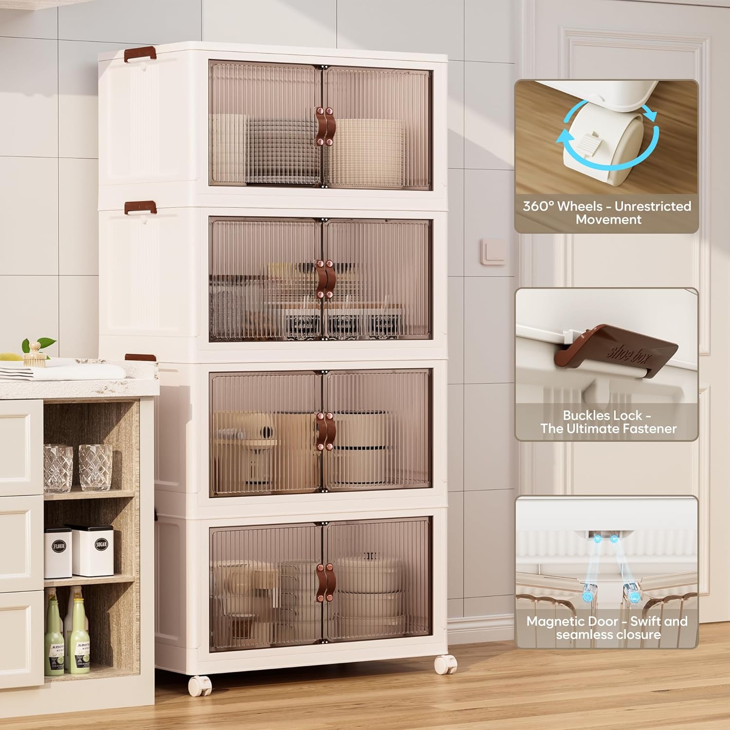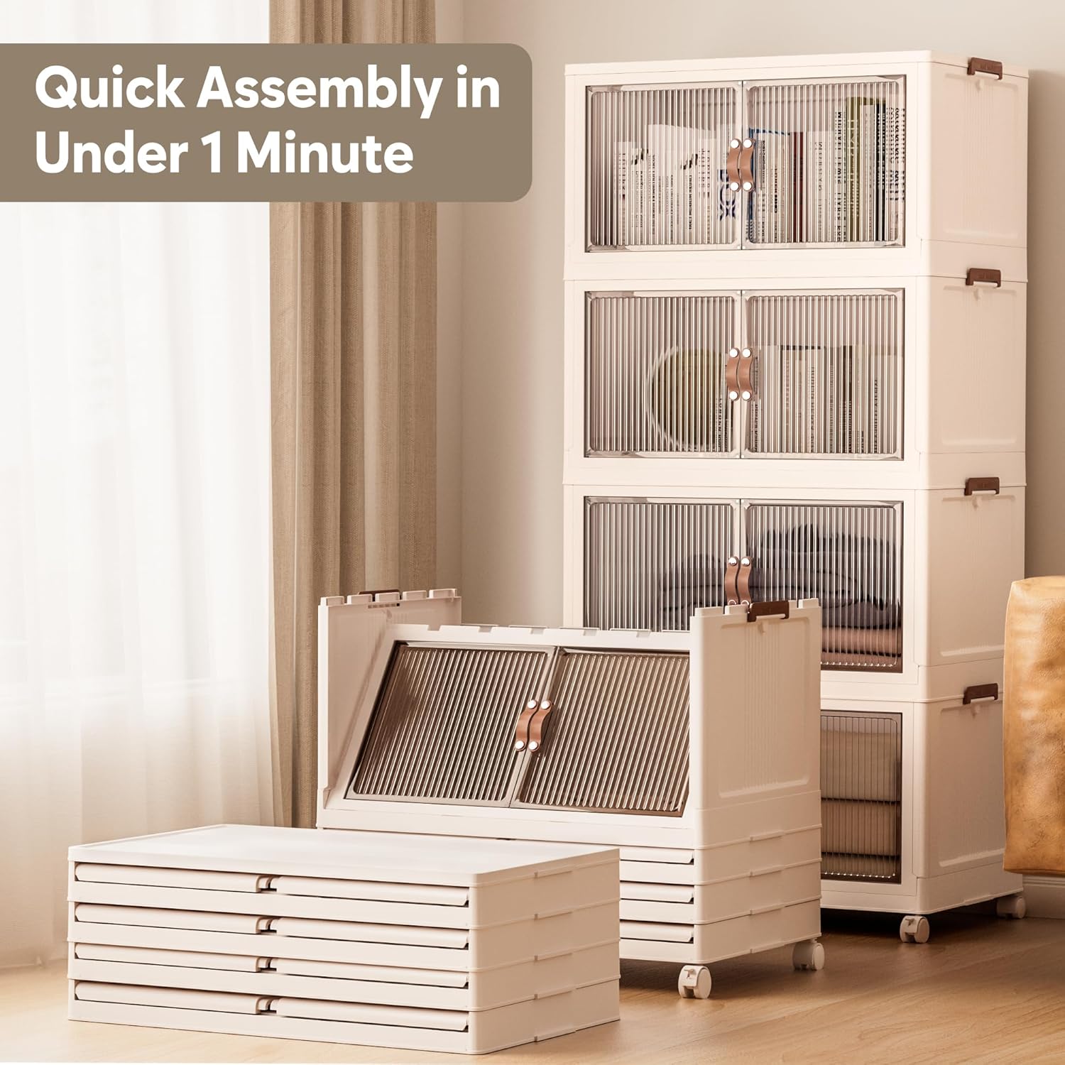 - 【Stackable & Magnetic Door & Rotating Wheels】The storage box has a groove design for stacking stackable storage bins. With side and rear buckles, the stacked boxes stay steady and secure. Equipped with four 360° rotating wheels, it’s easy to move and perfect for closet organizers and storage, keeping your space organized.