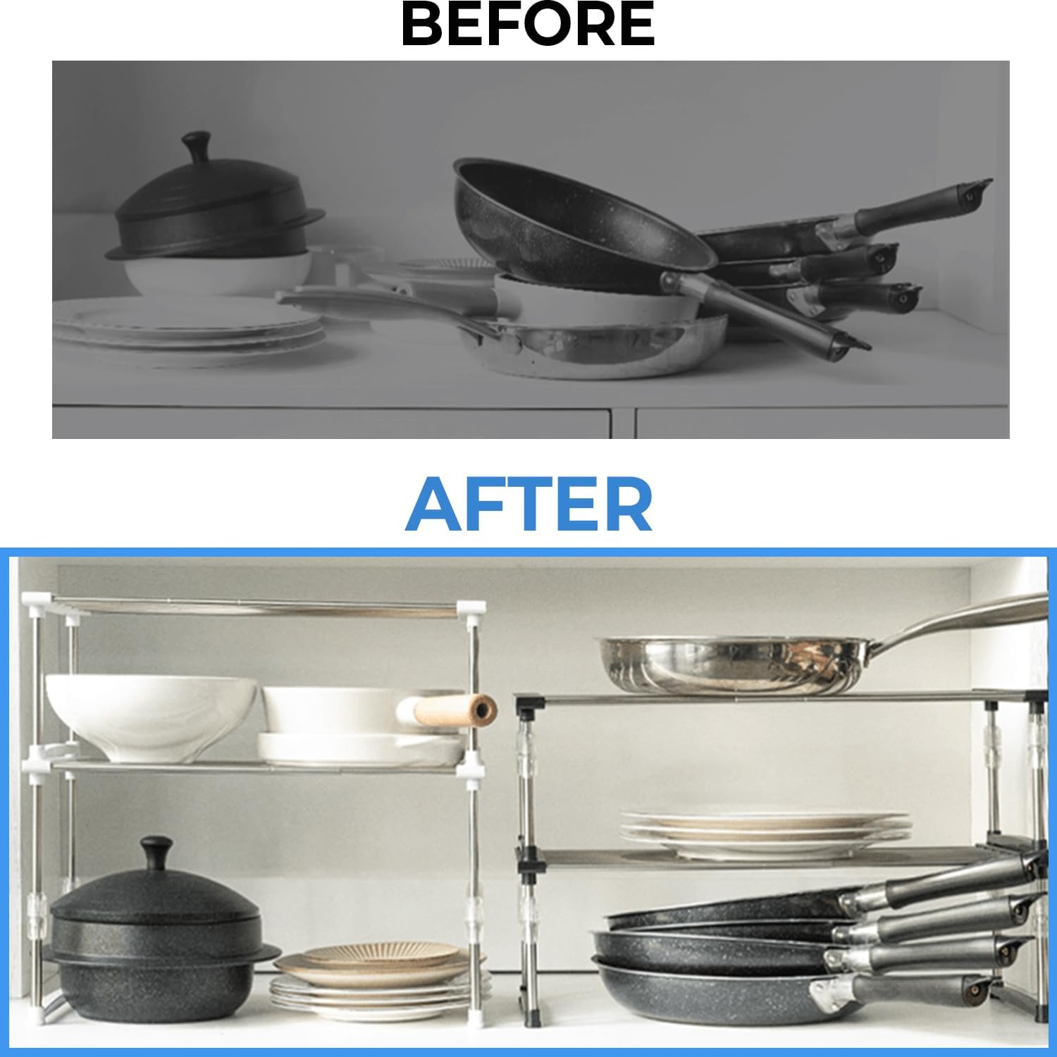 - **Efficient Space Utilization:** Maximize your kitchen space with this convenient shelves organizer. Perfect for small kitchens or crowded pantry shelves, it allows you to neatly arrange all your kitchen organizers and storage items effortlessly.
