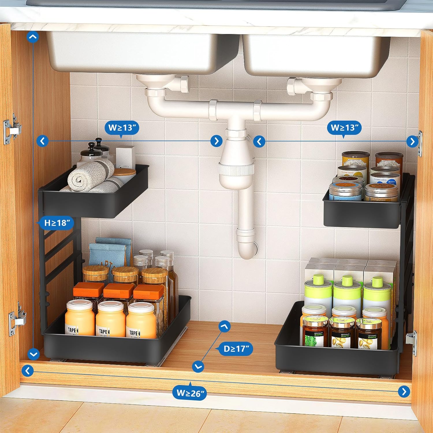 EVERIE Metal Pull Out Slide Shelf Organizer for Under Sink Organization in Kitchen, Bathroom, Counter, Cabinets, Minimum Available Space 13" Wide x 16.5" Deep (Black, 1 Set)