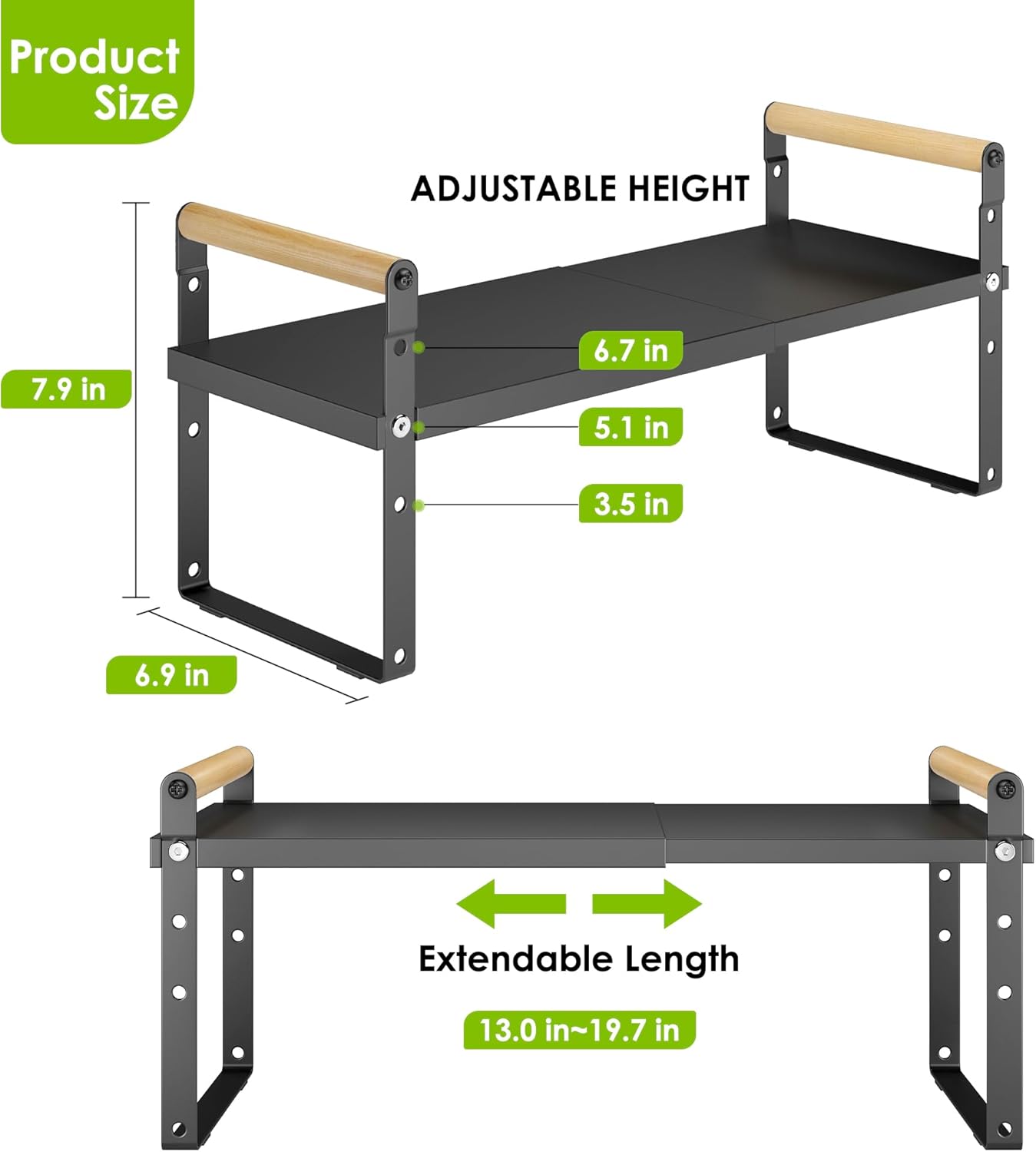 - ăExpandable & Stackable Cabinet OrganizerăThe length and height of this shelf can be adjusted, The length of expandable shelf can be adjusted from 12.87 to 21.04 Inches according to the different space; The Height can be adjusted from 5.3 inches to 7.68 Inches depending on how you want to arrange your space.