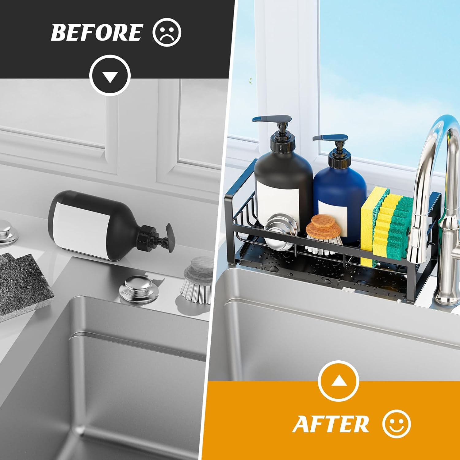Sponge Holder for Kitchen Sink,Stainless Steel Kitchen Sink Organizer with Auto Draining Tray,Countertop Sink Caddy for Sponge Holder Soap Brush Dispenser,Black-Large