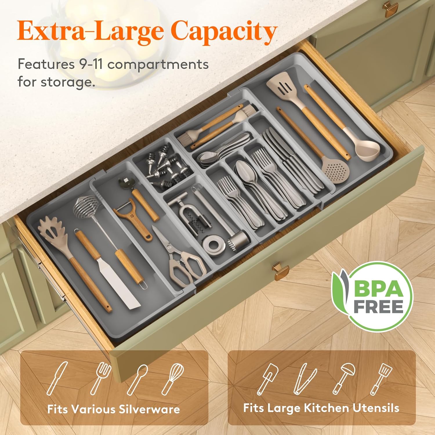 - Sort Your Silverware: The silverware tray comes with 9-11 compartments, creating more space in drawers for spatulas, ladles, tongs, utensil sets, and whisks. Streamline your cooking with a no-install organizer that keeps cutlery at your fingertips