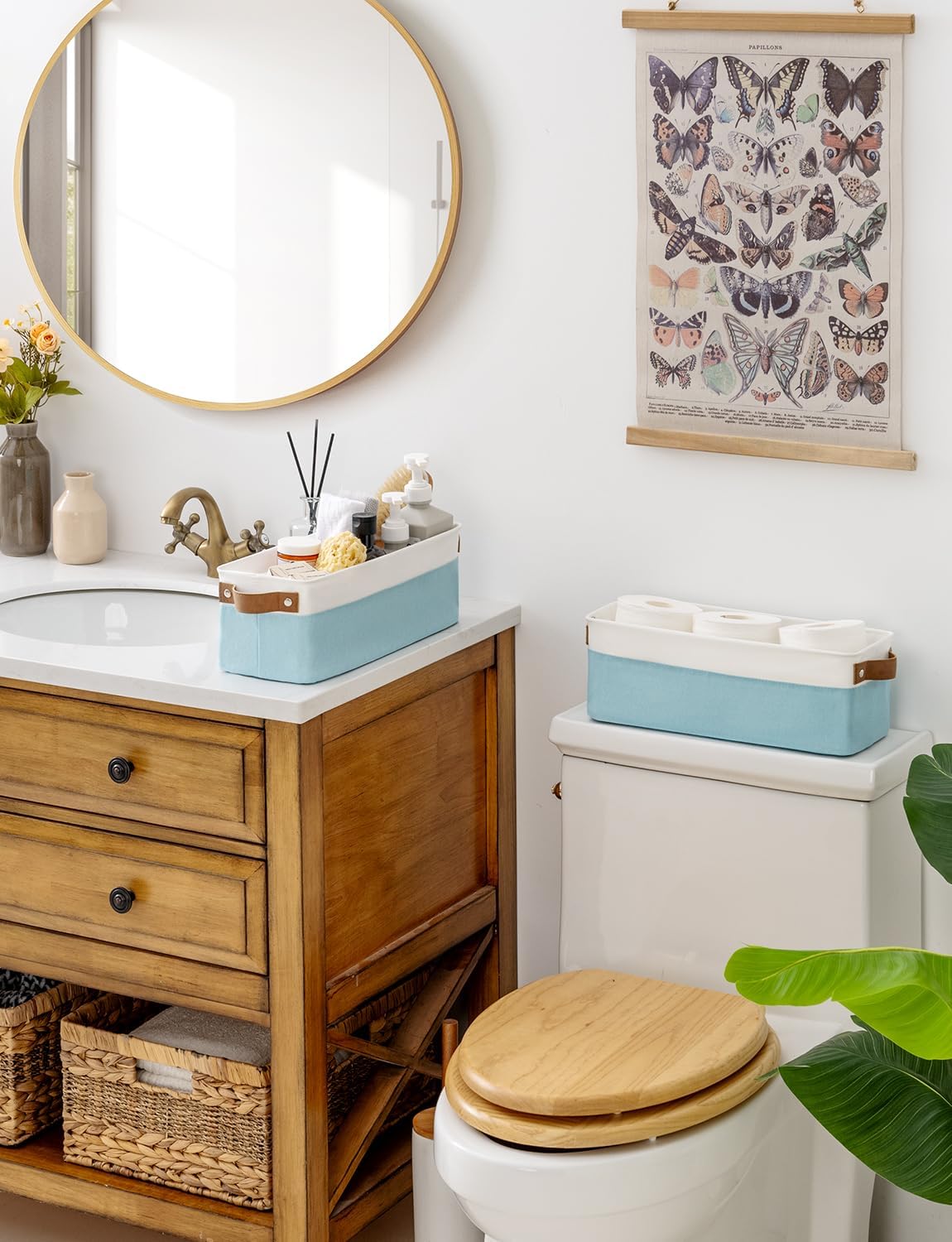 StorageWorks Narrow Storage Bins, Small Basket for Closet and Shelves, Fabric Organizer with Handles, Toilet Paper Storage, Light Blue and White, 2-Pack