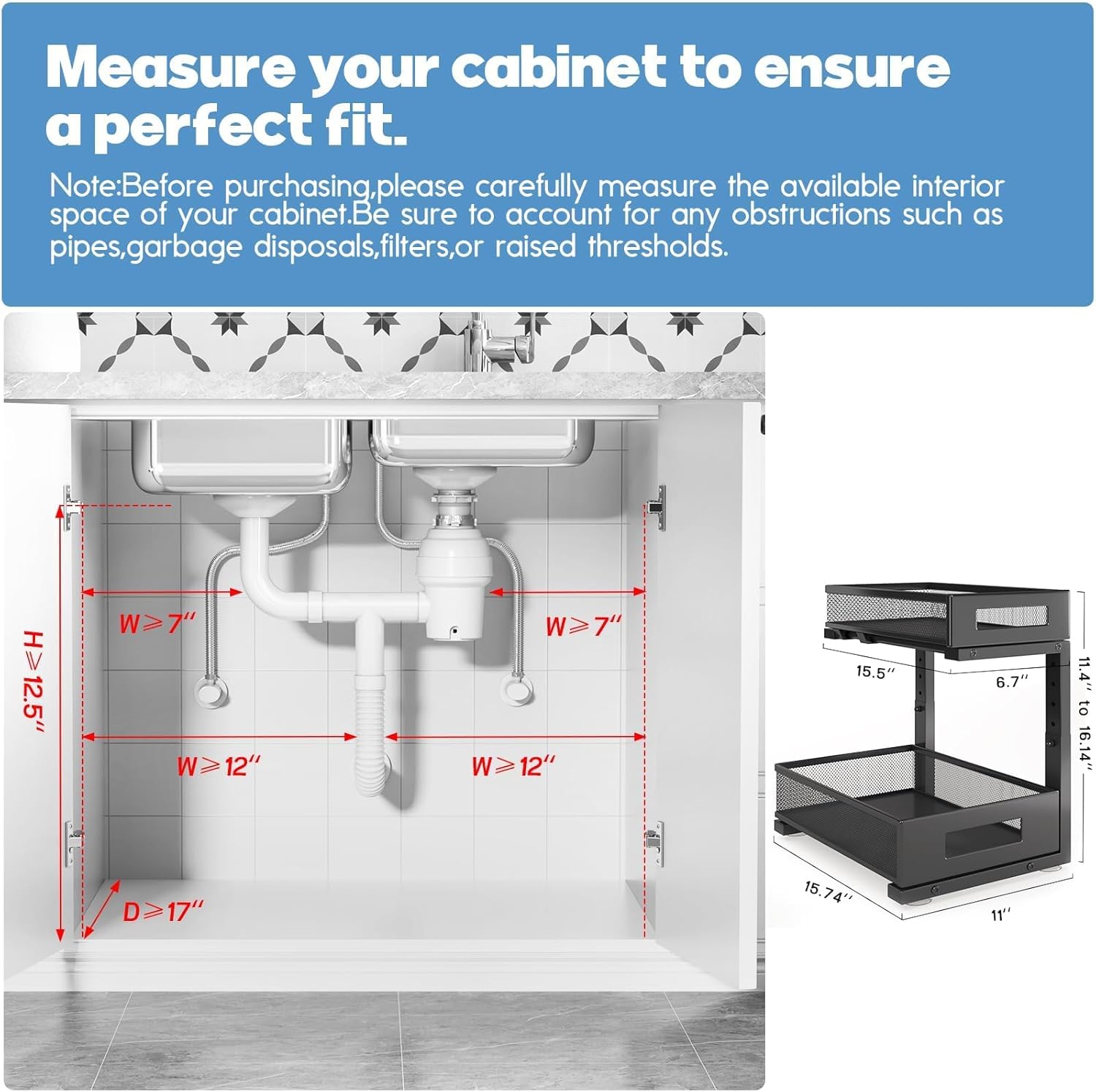 - 【2-Tier Pull-Out Design for Easy Access】This under-sink organizer features a double-layer pull-out design, allowing you to easily access items at the deepest part. The upgraded, thickened iron circular sliding rails ensure a smooth and seamless pulling experience, making each use effortless. The unique pull-out locking mechanism effectively prevents the drawers from being completely pulled out, avoiding the risk of items falling or structural damage caused by over-pulling, ensuring safer and more convenient use.