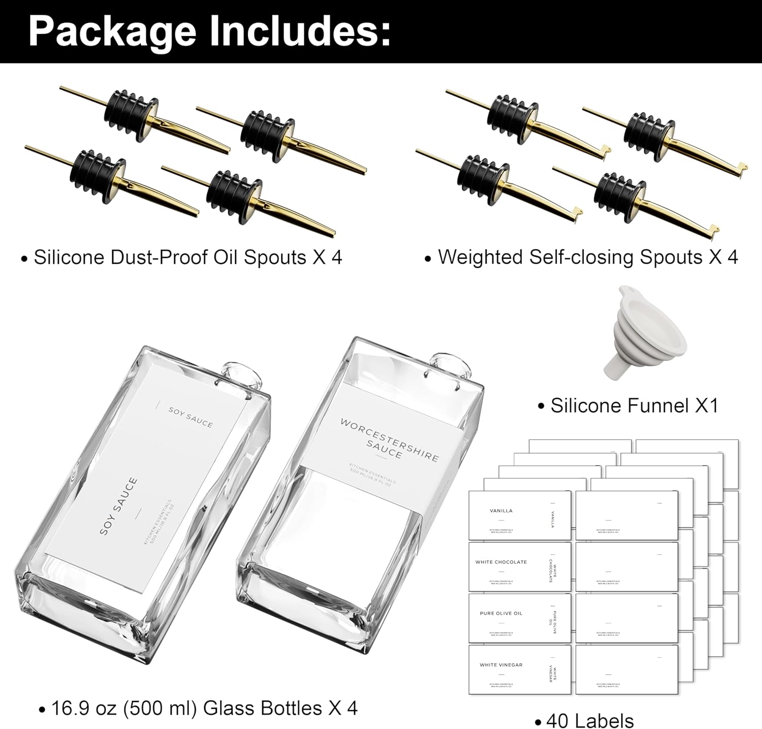 - Modern Kitchen Essential: Elegant and minimalist olive oil dispenser bottle include 4 high-quality 16.9 oz (500 ml) glass bottles, 4 weighted self-closing spouts, 4 Silicone Dust-Proof Oil Spouts, 1 funnel and a set of 40 labels, making them a must-have for any kitchen. Practical and decorative for your kitchen counter, these cooking oil dispenser meet all your kitchen needs for style and functionality!