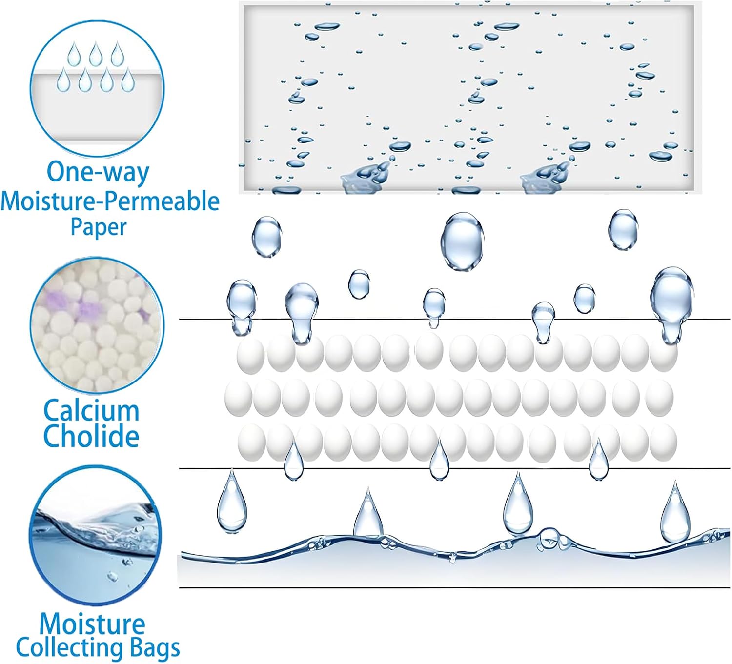 - Dehumidifier bags use Spherical calcium chloride to enlarge the area to absorb quickly. One-way moisture permeable paper absorbs effectively. 400 ml/pack large capacity moisture absorption keep dry for a long time.