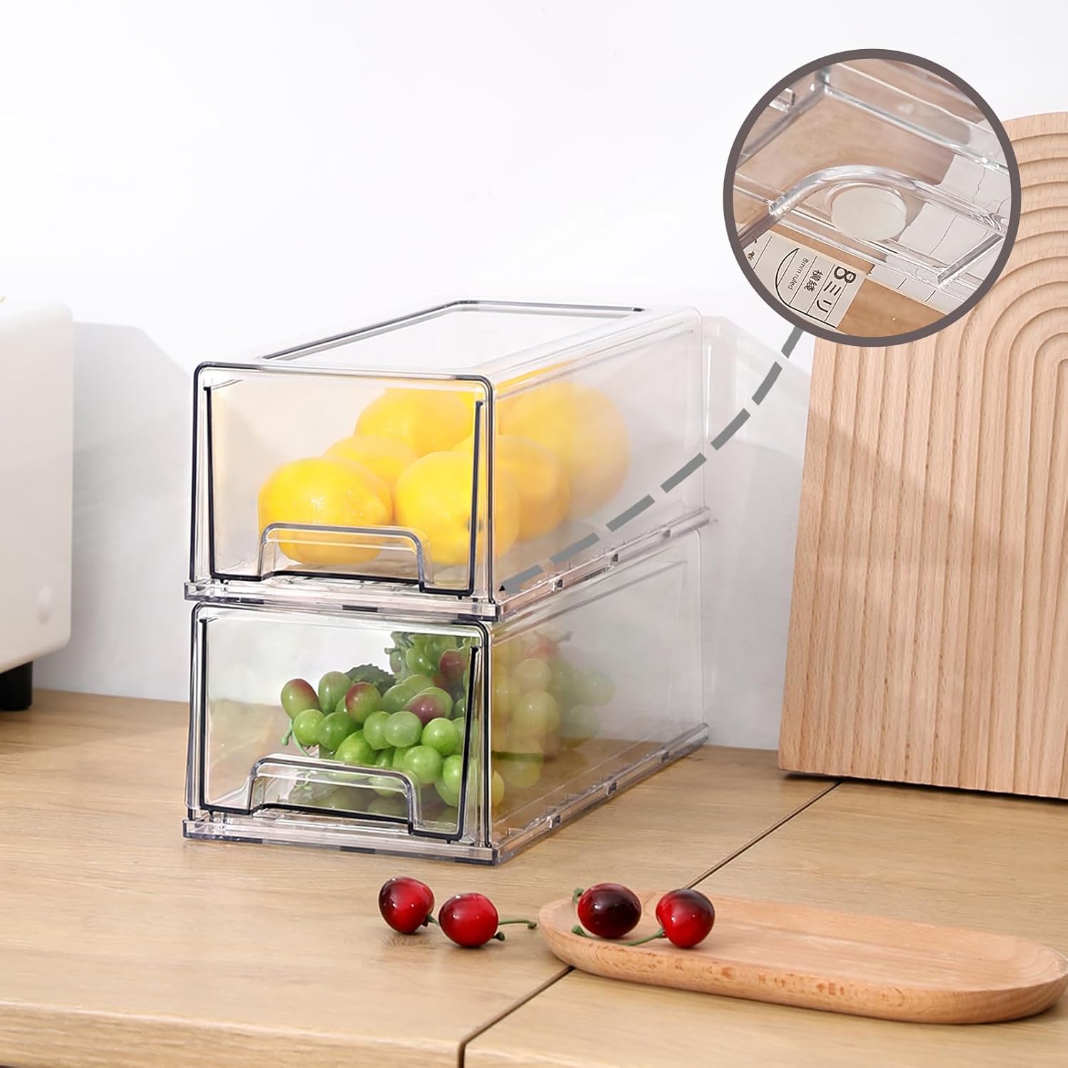 PeJeyiee 2 Pack Clear Stackable Refrigerator Organizers and Storage Drawers - Pull-Out Fridge Bins with Anti-Slip Base & Easy Clean, Plastic Organizers for Kitchen Pantry Cabinet Closet (Medium)