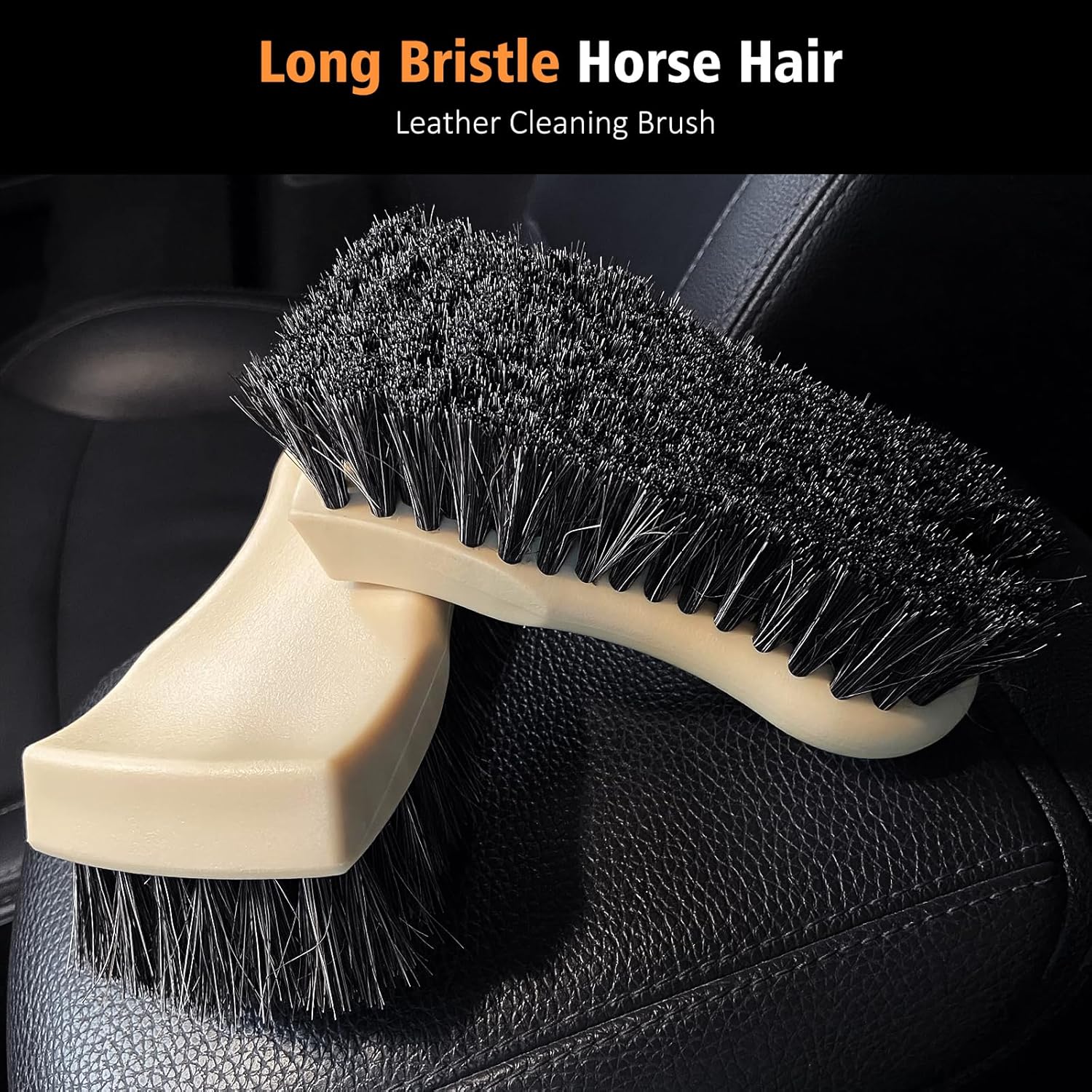 - GENTLE YET EFFECTIVE LEATHER BRUSH FOR CAR DETAILING: Our horse hair brush for leather is designed with with soft bristles to gently clean delicate surfaces such as car interiors and leather seats. The natural horsehair bristles effectively remove dirt, grime and debris without scratching or harming leather surfaces, ensuring a thorough yet gentle clean every time