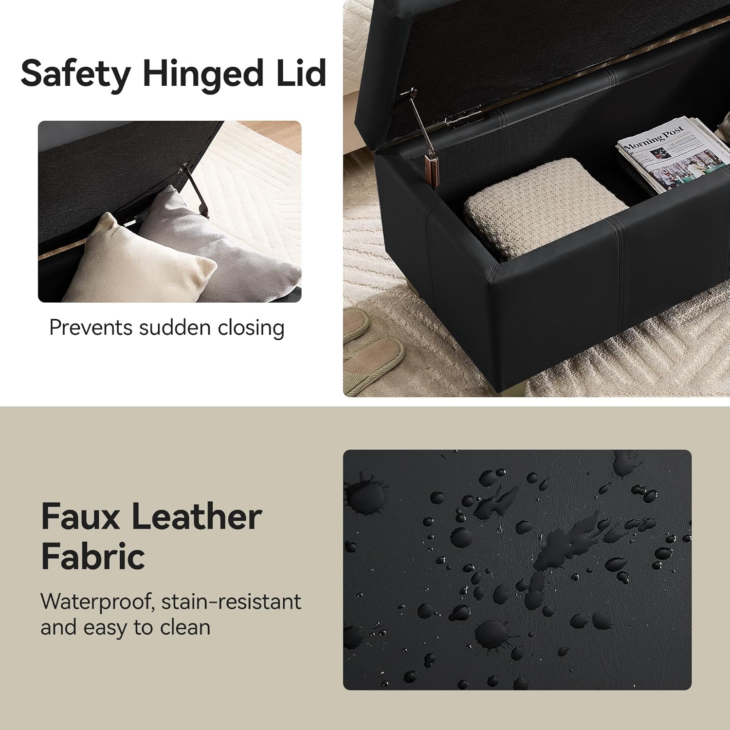 - PREMIUM MATERIALS: Our storage ottoman crafted with premium faux leather and sturdy wooden leg, high elasticity sponge filling the seat cushion, which is waterproof and wear-resistant, this ottoman ensures stability, comfort, and long-lasting quality.