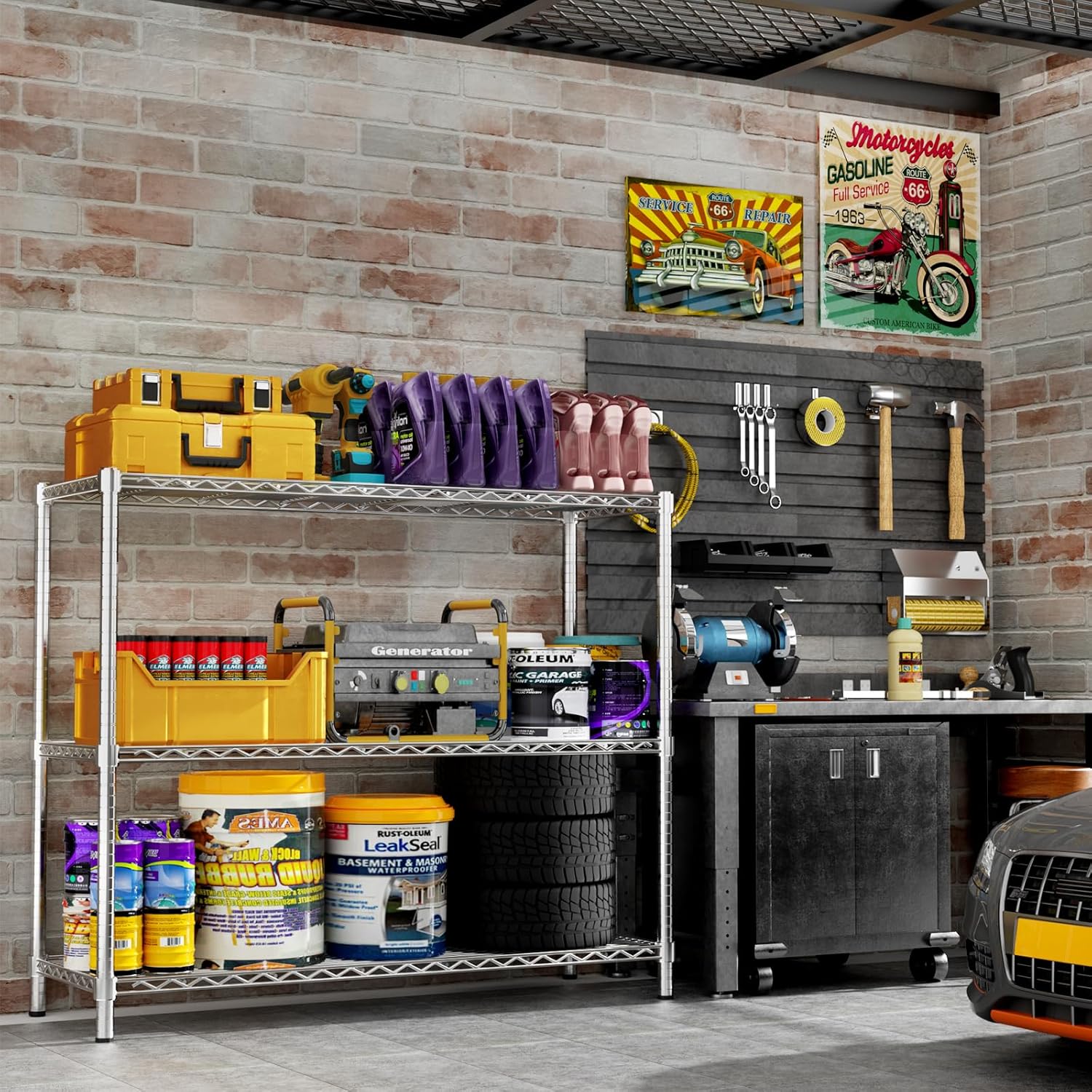 - 1200 LBS 3 tier Storage Shelves: Kitchen Shelving features thickened heavy steel columns, supporting up to 400 lbs per layer and a total capacity of 1200 lbs; It finish resists water, rust and corrosion, ideal for supplies in garage, kitchen, laundry room