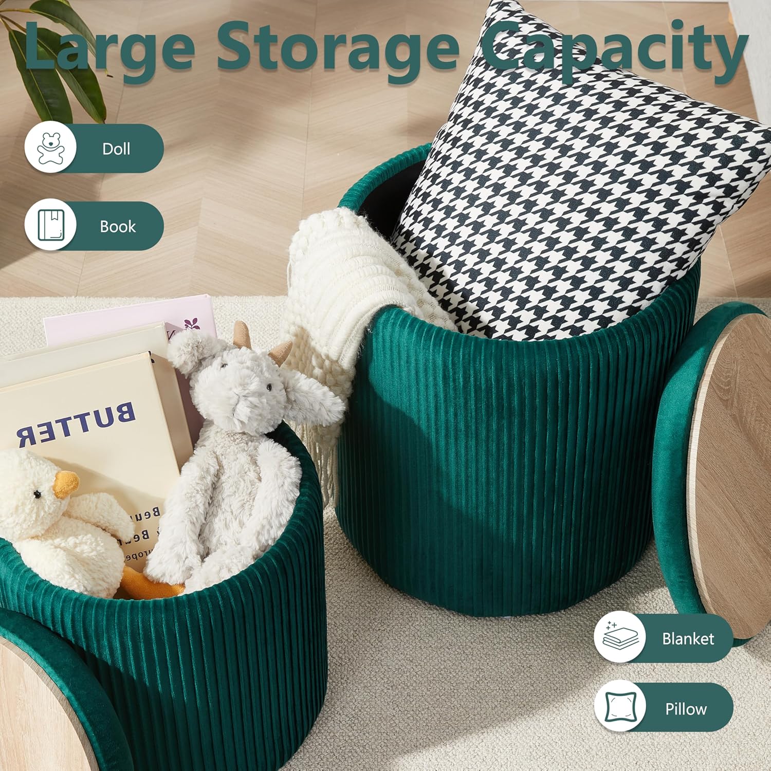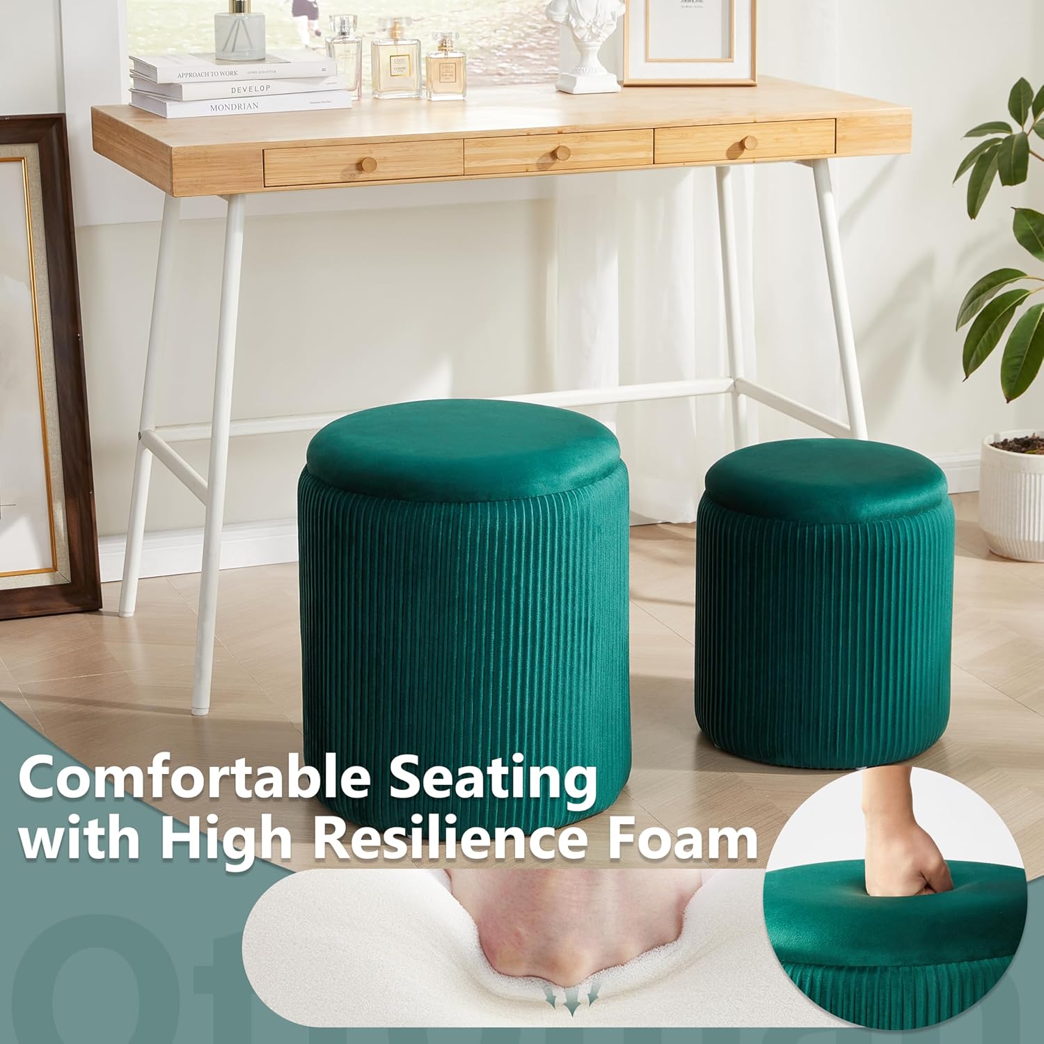Royal Windsor Round Ottoman with Storage Set of 2,Vanity Stool with Storage for Bedroom, Ottoman Coffee Table, Small Velvet Foot Stool for Living Room, Green