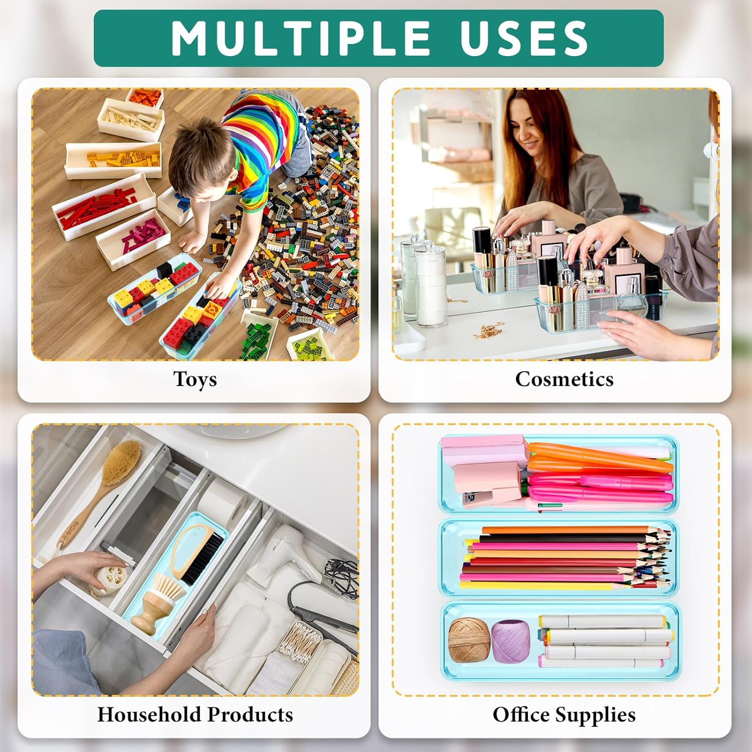 - Widely Applicable: the silverware drawer organizer tray can be applied to your kitchen, bathroom, office, countertop, cabinet, vanity, table and so on, ideal for storing toiletries, makeup tools, makeup, office supplies, kitchen utensils, jewelry, silverware and more, making your places organized and tidy