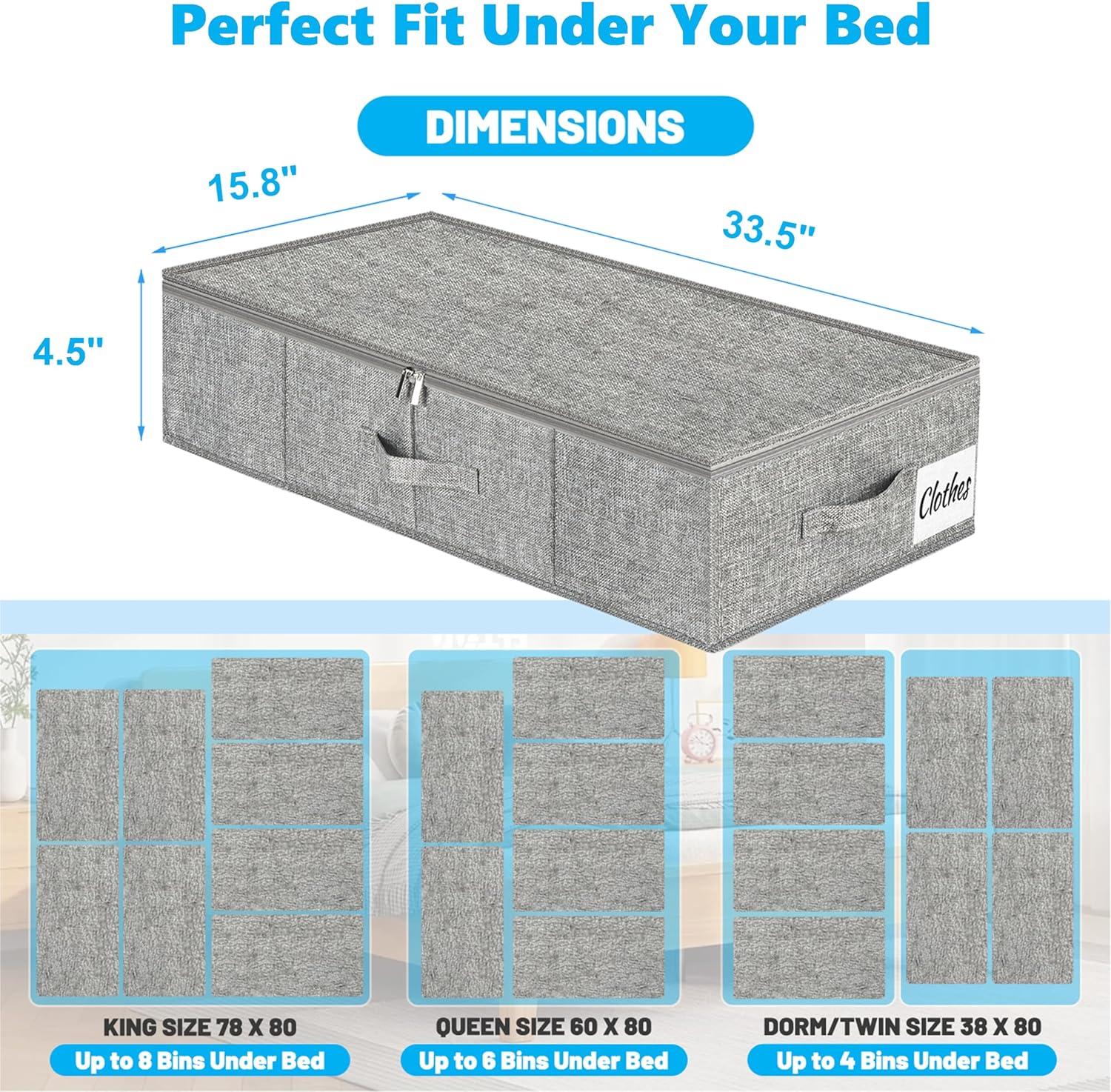 - LOW PROFILE UNDER 5 INCHES but Ample Capacity: Measuring 33.5" x 15.8" x 4.5", these under bed storage containers of the Slim series can fit effortlessly under most beds and sofas, while providing ample space for clothes, comforter, bedding, shoes, toys and blanket storage. Their low profile makes them a versatile solution for closet organizers and storage, especially in dorms and apartments where space is tight.
