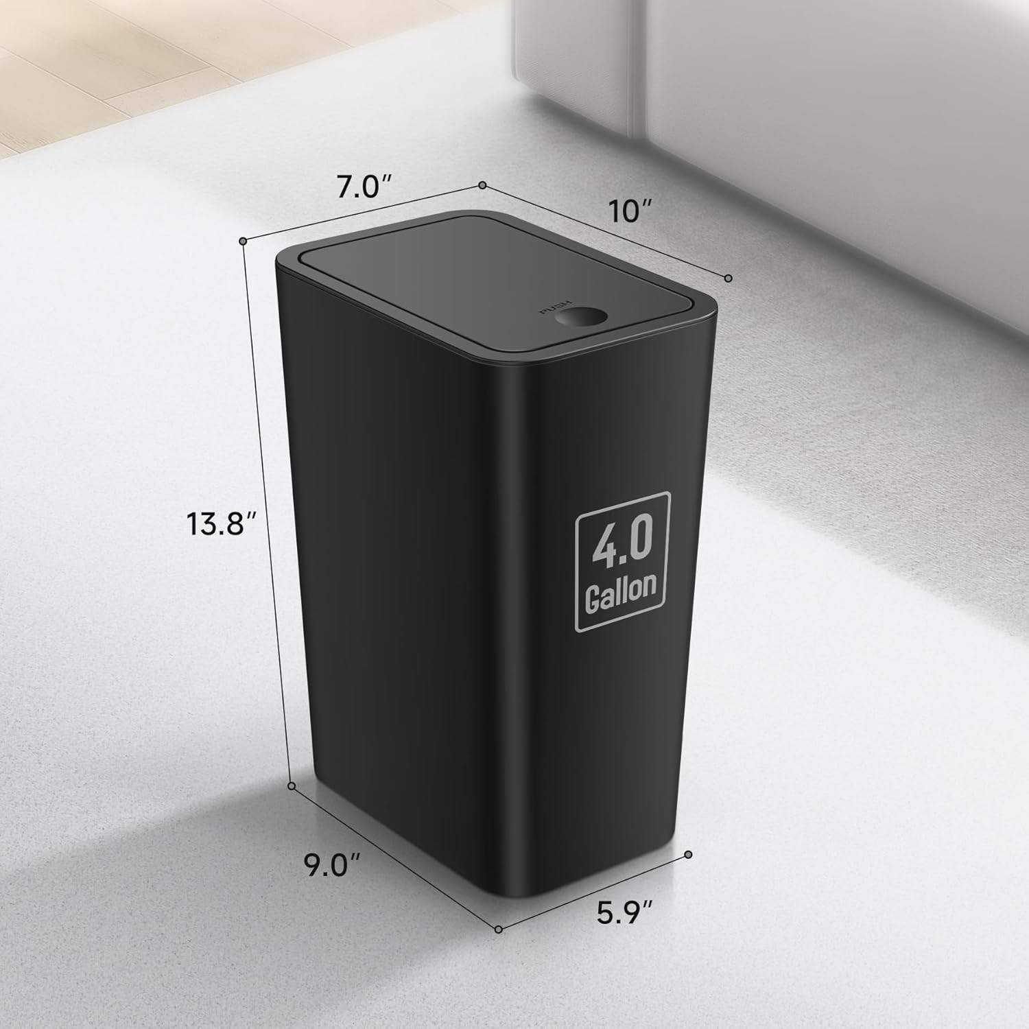 TIPGO Bathroom Trash Can with Lid, 4 Gallon / 15 Liter Small Garbage Can, Press Top Bin, Plastic Wastebasket with Pop-Up Lid for Bedroom, Living Room, Office (Black)