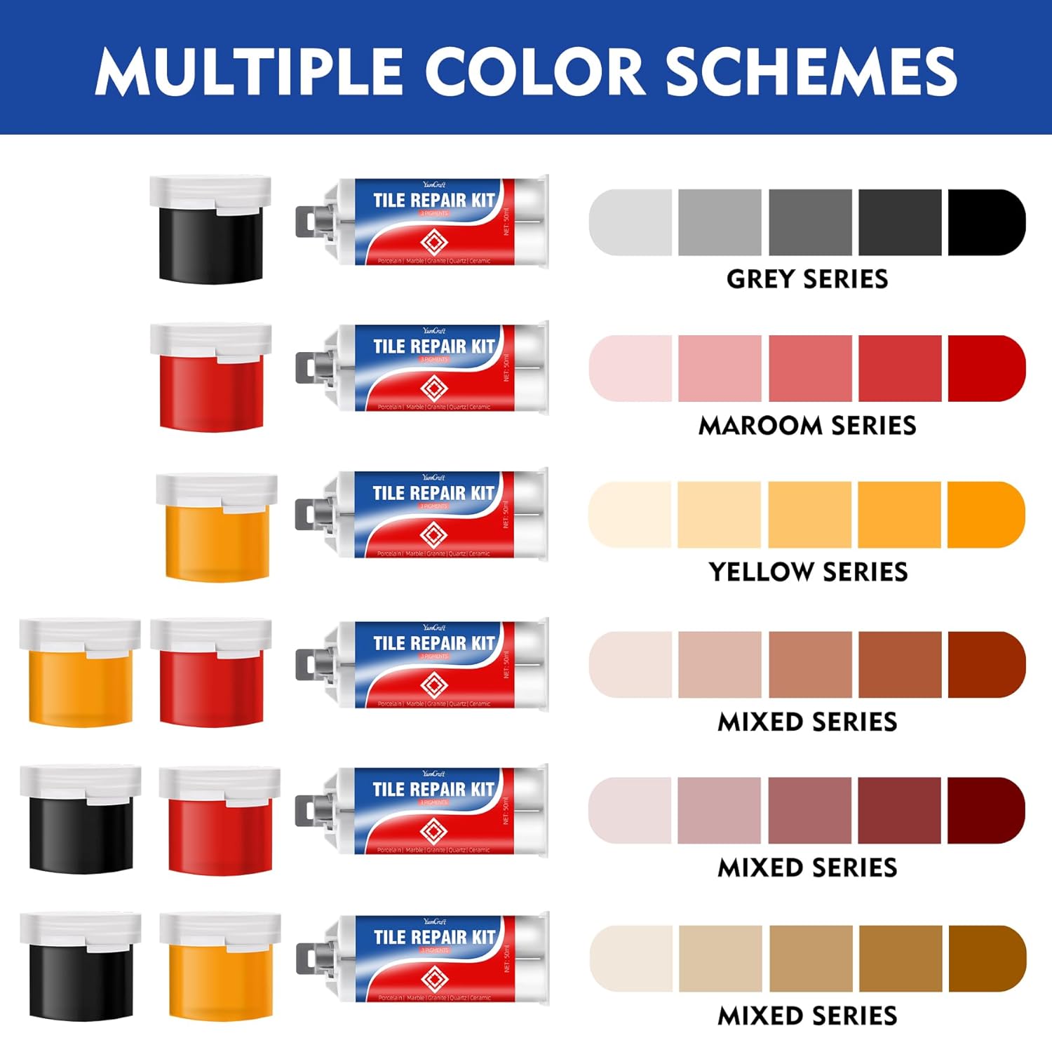 - The Kit Includes: 100ml tiles and bathtub repair kits including 2 tile repair kits, 1 Silicone Cup, 4 Stirrers, 2 Pairs of Gloves, 1 Push Rod, 2 Sandpapers, 1 Scraper, and 3 colors of paint: black, red, and yellow. After getting them, ensure that you can use them yourself without any tools.