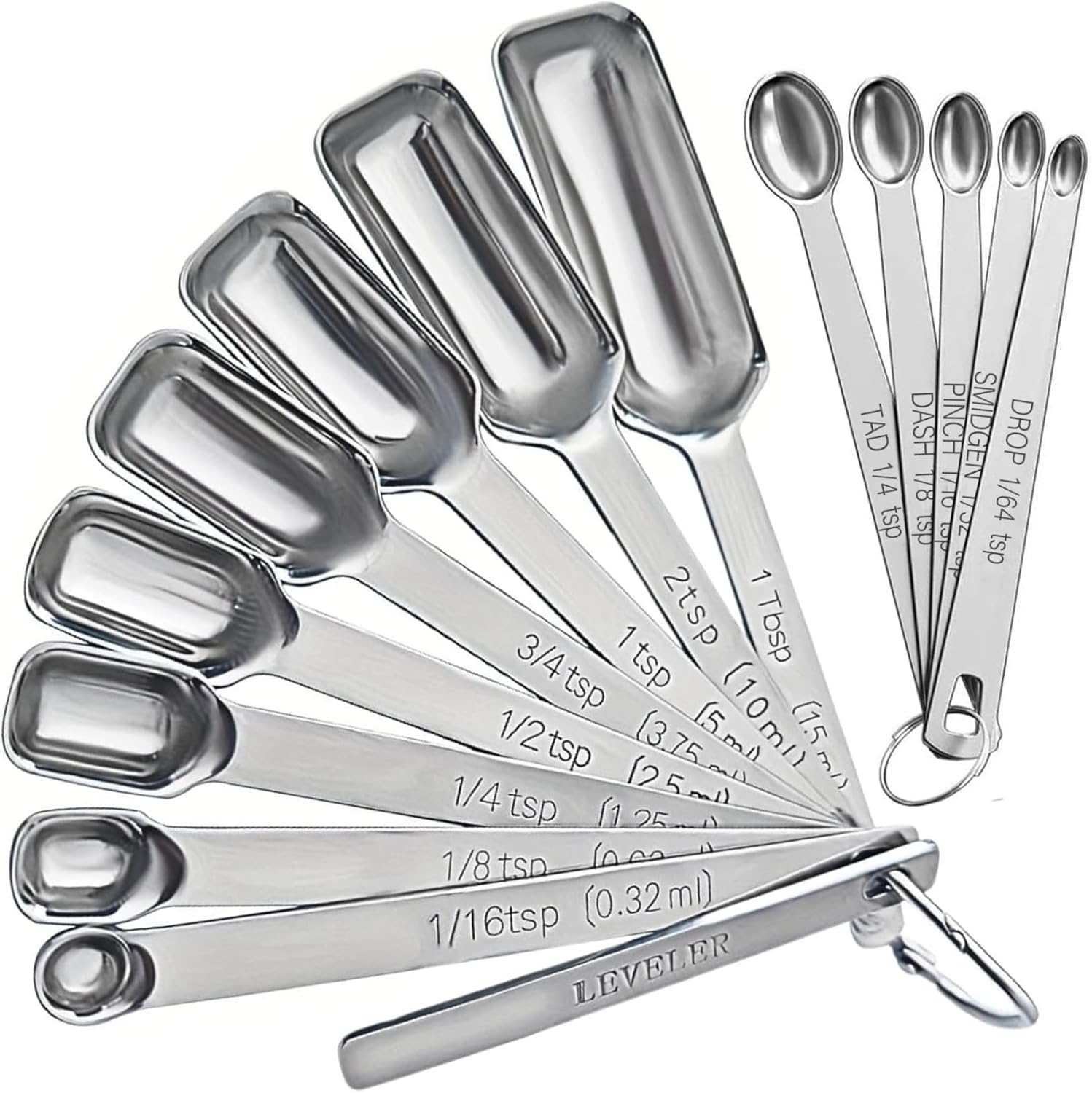 - COMPLETE 14-PIECE SET: This package includes 8 Narrow spoons (1/8, 1/4, 1/2, 3/4, 1, 2 tsp and 1 tbsp), 1 Leveler & 5 Mini Spoons (Tad, Dash, Pinch, Smidgen, Drop). This complete set meets all your cooking and baking needs, saying goodbye to inaccurate portion sizes and ensuring perfect taste.