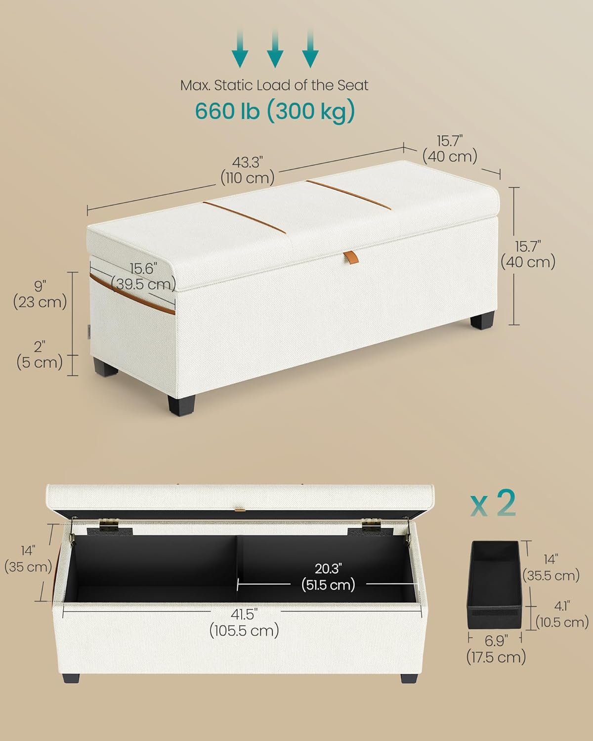 SONGMICS Storage Ottoman Bench, Storage Chest, 15.7 x 43.3 x 15.7 Inches, End of Bed Bench, 27 Gal. (103 L), for Bedroom, Entryway, Living Room, Cream White ULSF533W01
